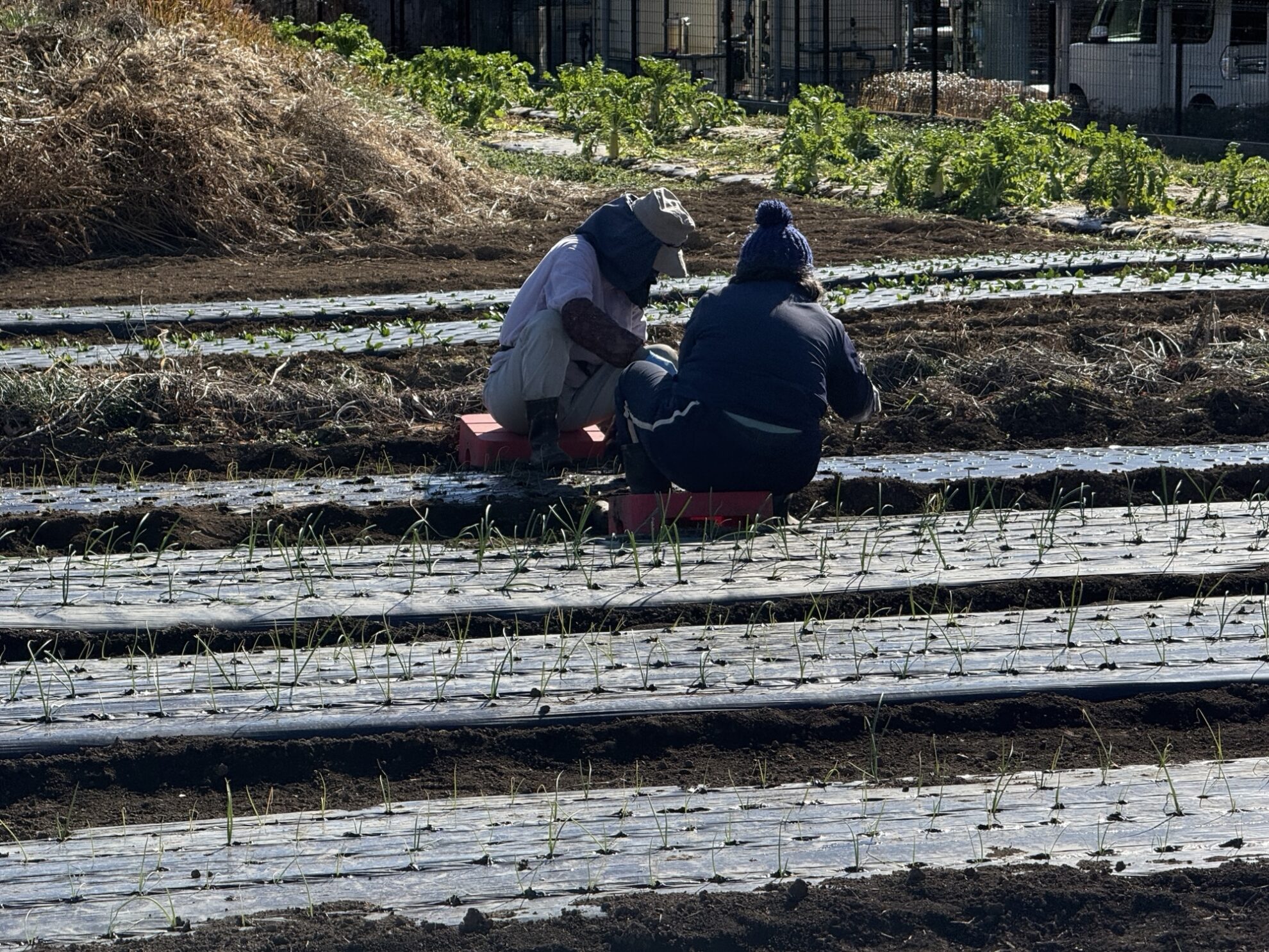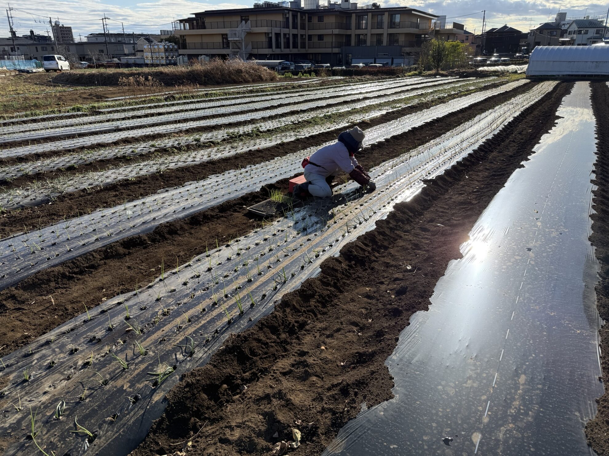 斉藤さんの下の畑で、玉ねぎ(甘70)の定植補植作業。