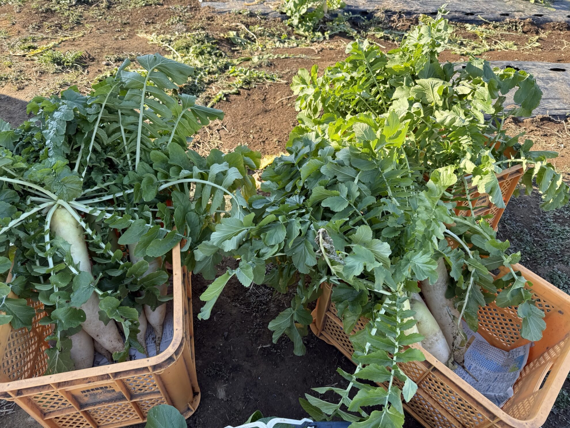 田中さんの上の畑で、春菊、長ネギ、赤大根の収穫作業。