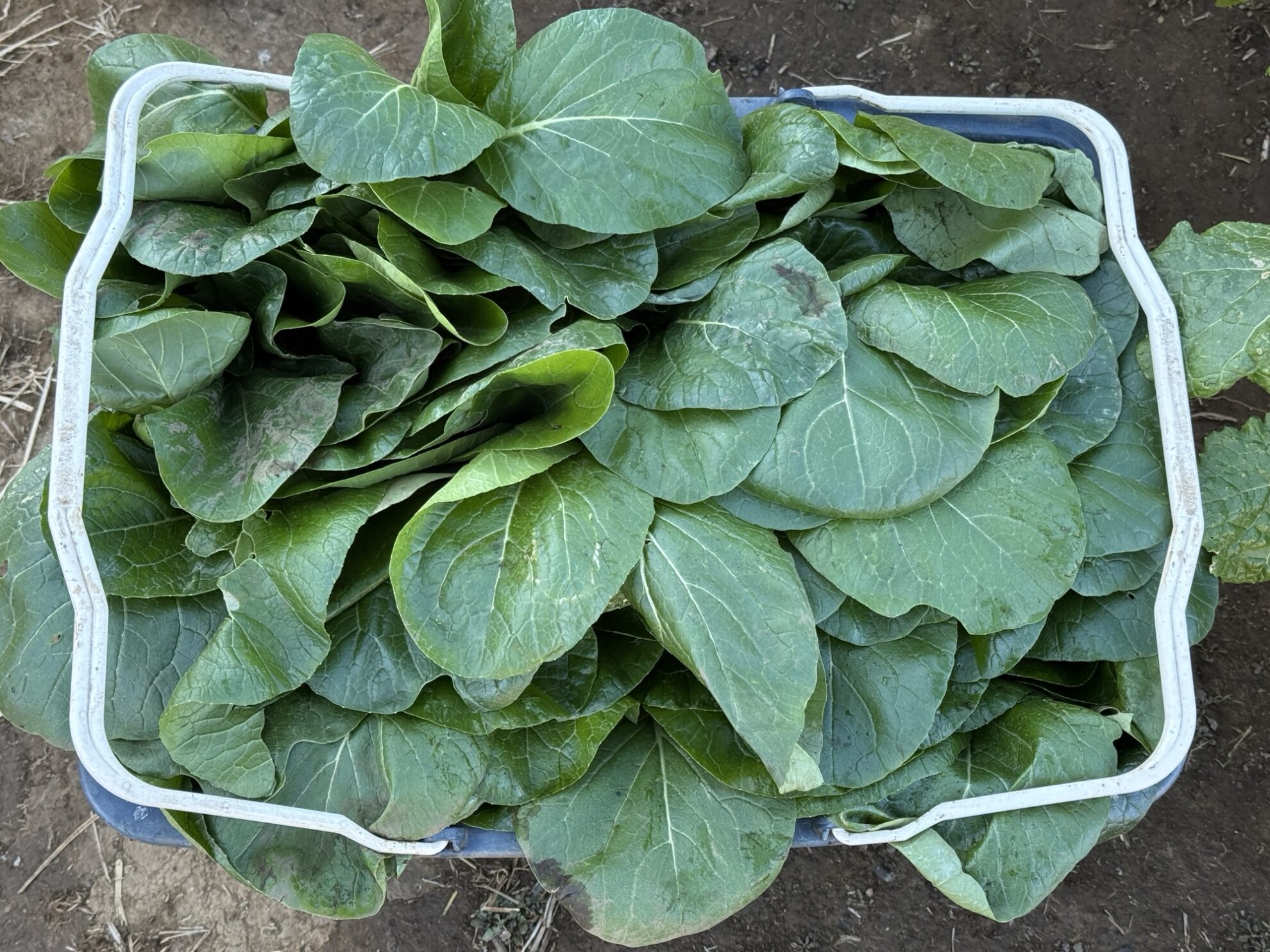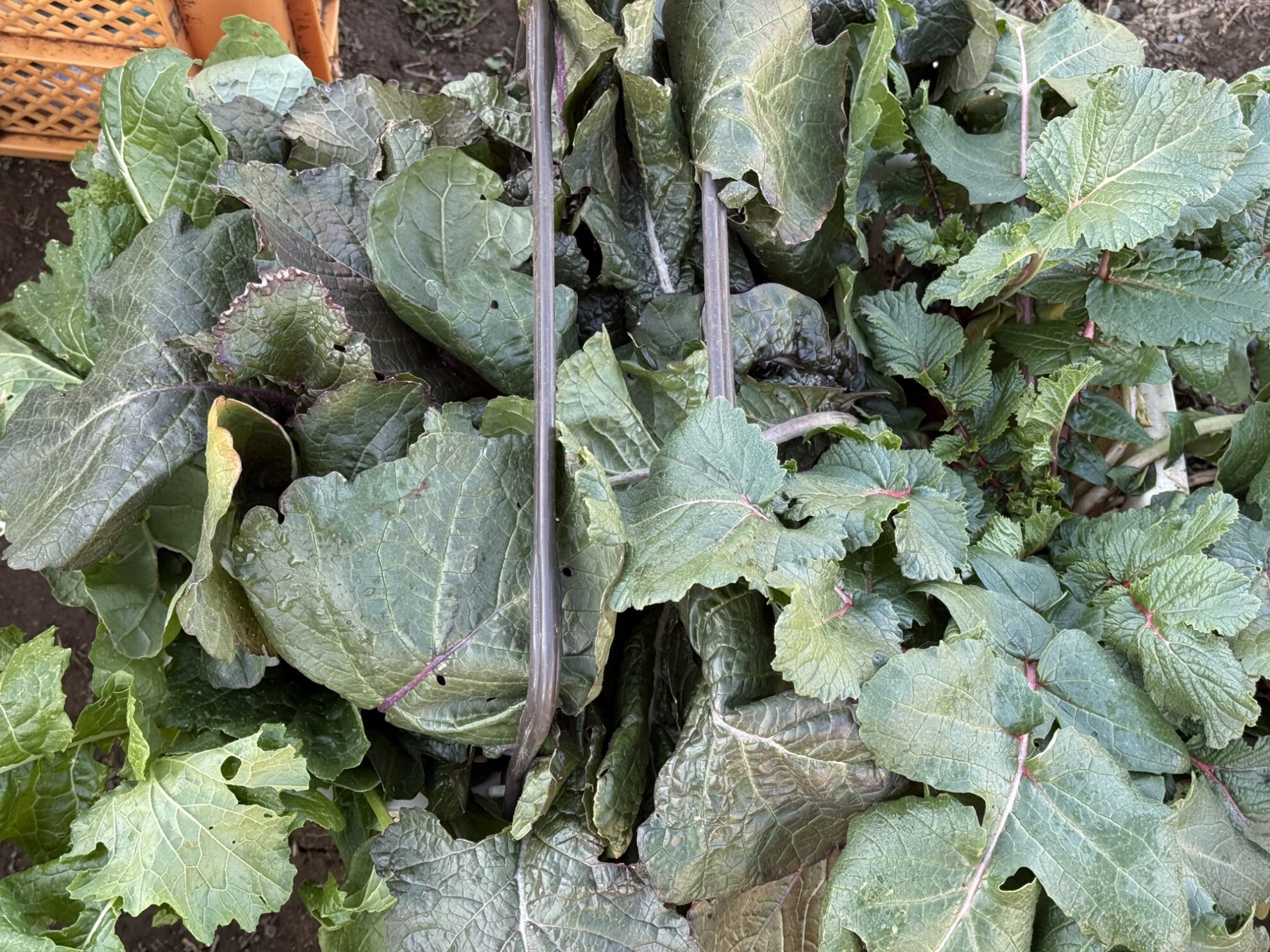 斉藤さんの上の畑で、赤大根、ビーツの抜き菜、小松菜の収穫作業。