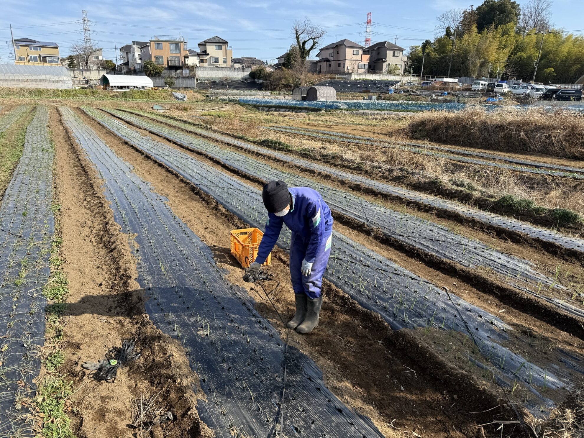 斉藤さんの下の畑で、玉ねぎのマルチが風で剥がれるのを防ぐためにハウスバンド張り作業。