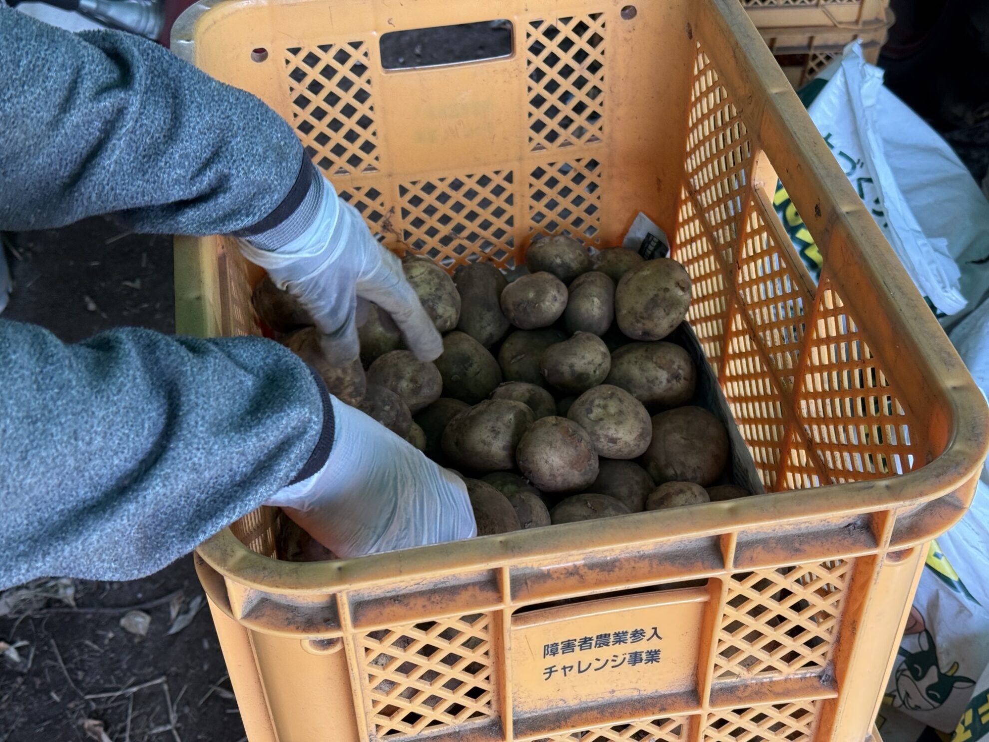 斉藤さんの下の畑の休憩所で、ジャガイモの選別と運び出し作業。