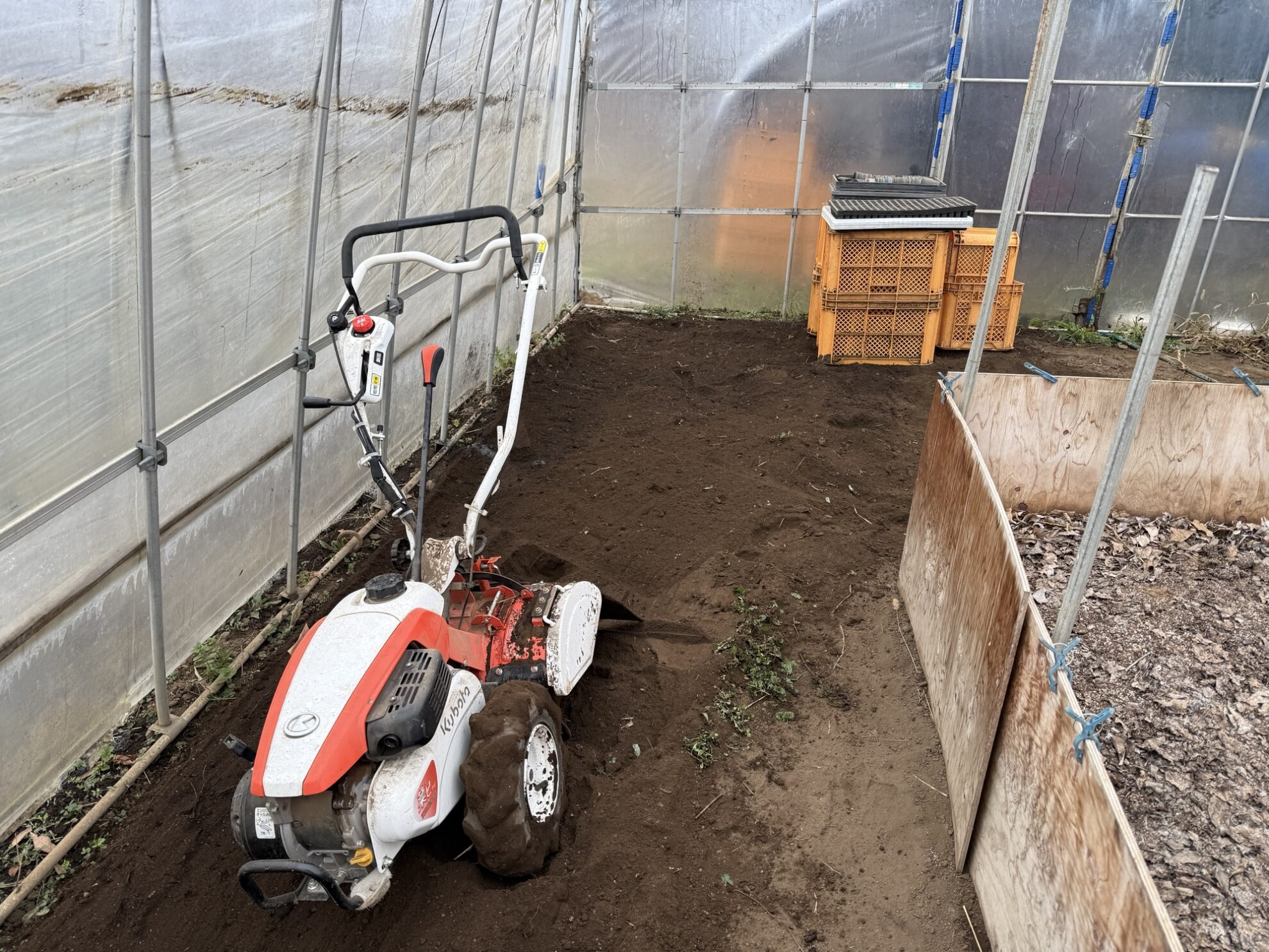 斉藤さん畑のビニールハウス内で、パセリを植える為に鶏糞と有機石灰を撒いて小型耕運機で耕耘作業。