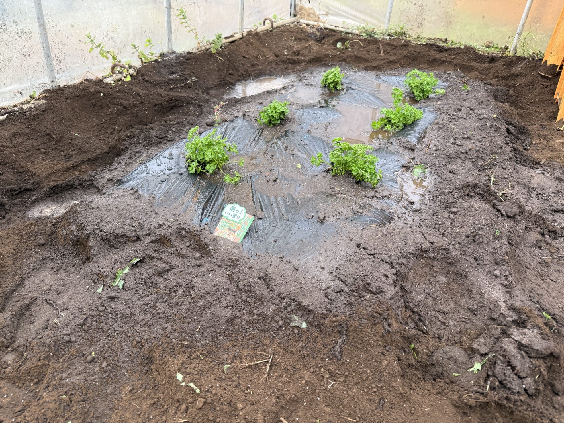 パセリ用のマルチを張った後に、パセリの定植作業と水やり作業。