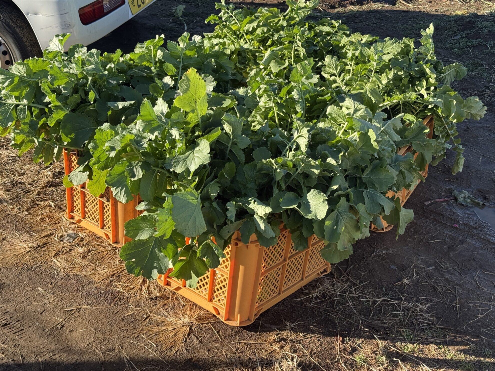 吉岡さん畑で、葉玉ねぎ、青首大根の収穫作業。