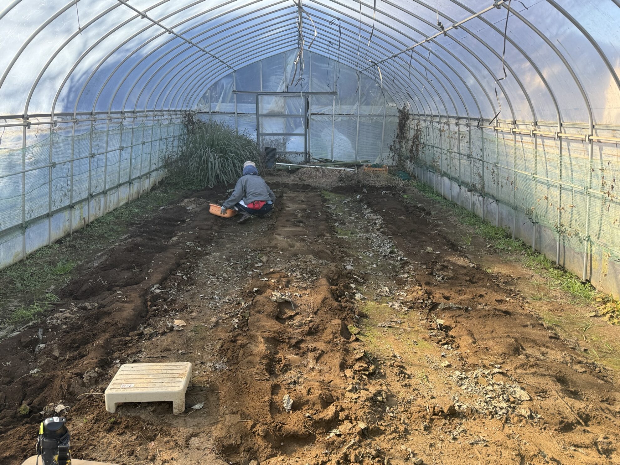鈴木さん畑のビニールハウス内で、ズッキーニの撤去作業。