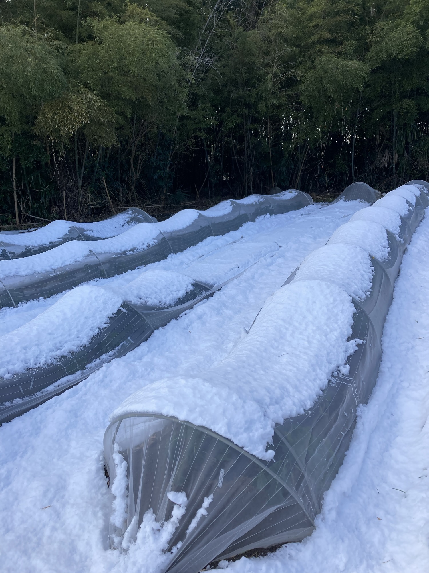 鈴木さん畑のブロッコリーのトンネル支柱が一部雪で倒壊して倒れていました。