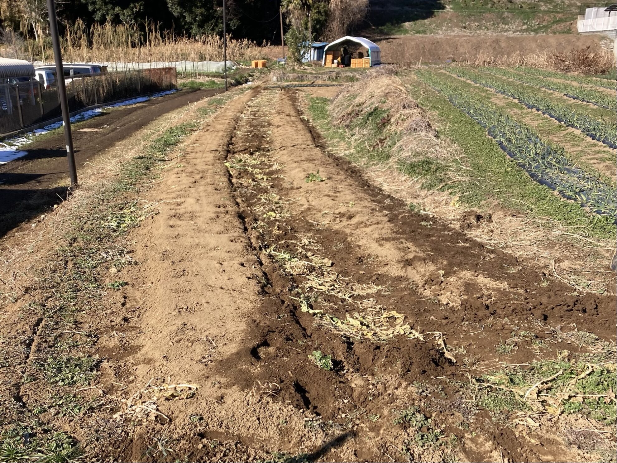 2026年1月6日(火)の作業記録 (ブロッコリーのトンネル倒壊直し作業、青首大根のマルチ剥がし作業、里芋保管用に穴掘り作業、らっきょう周りの除草作業)