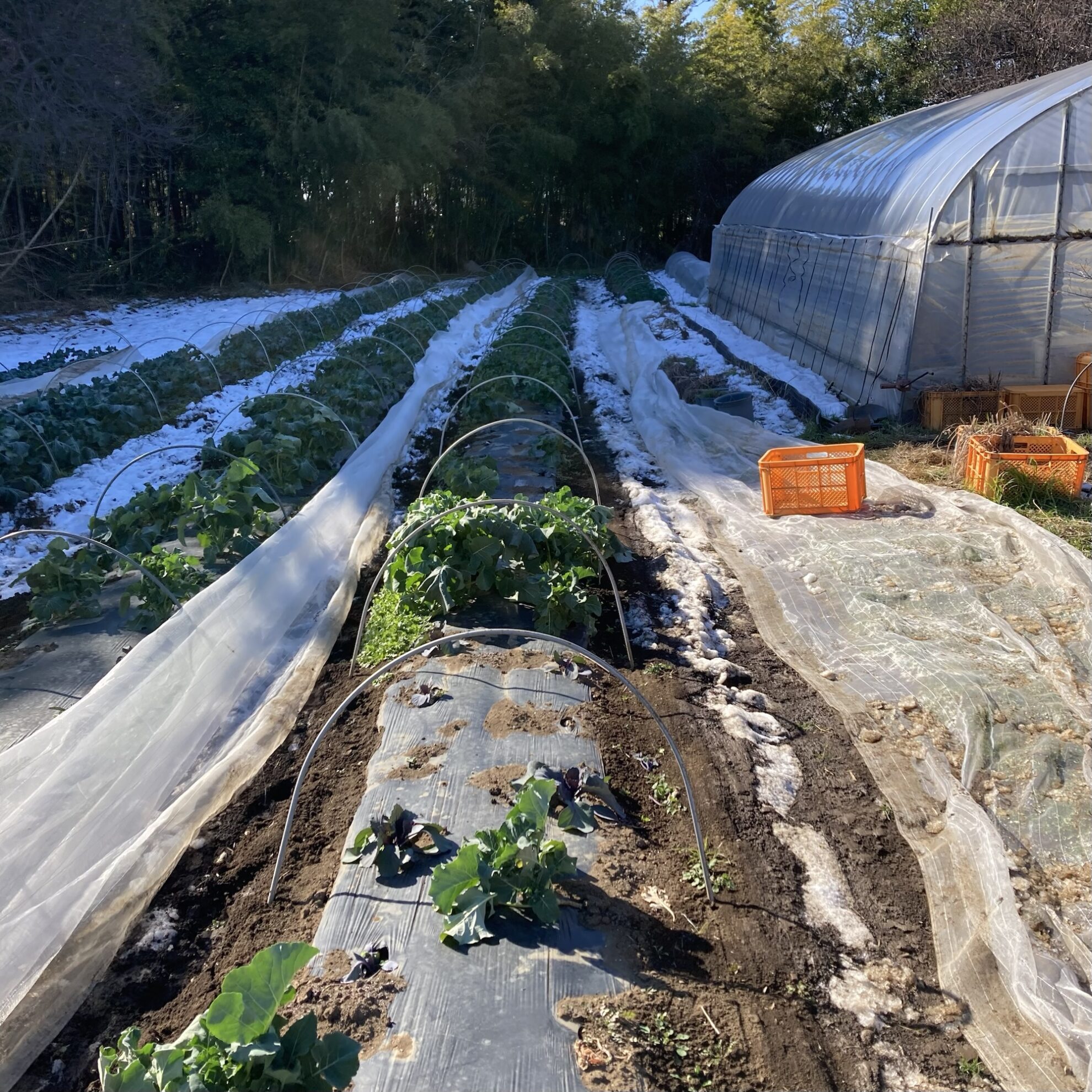 鈴木さん畑で、ブロッコリー類の倒壊したトンネル支柱を直す為に、防虫ネットを外して雪を落とす作業を行いました。