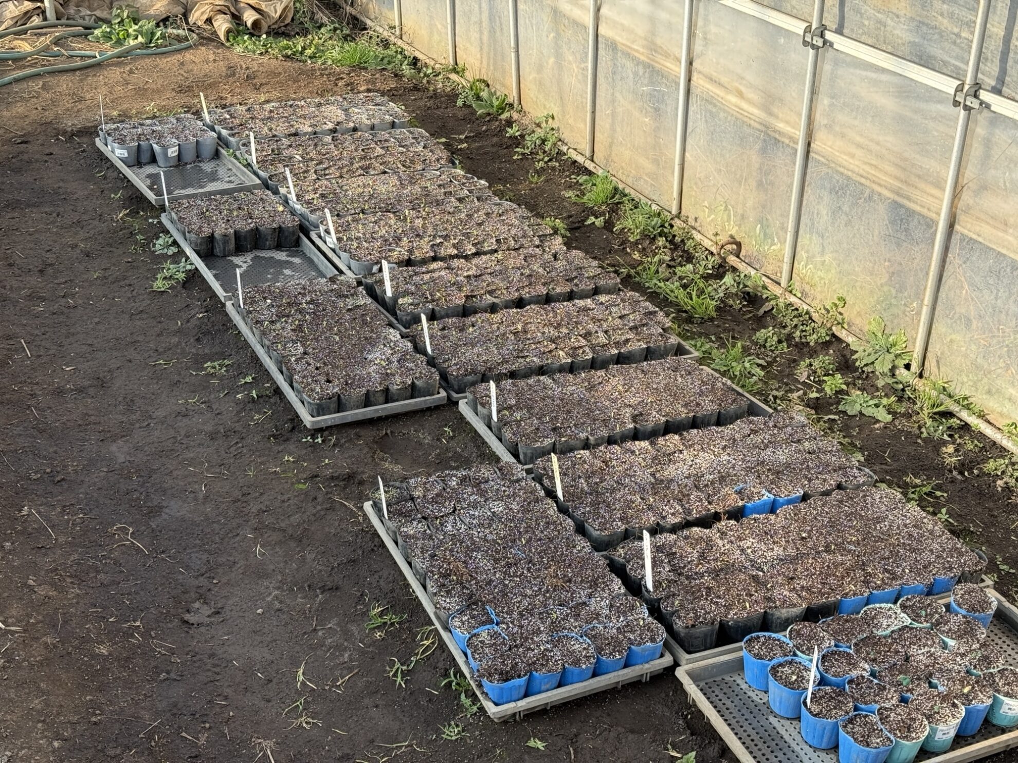 斉藤さん畑のビニールハウス内で、絹さや、スナックエンドウ、そら豆、グリーンピース、玉ねぎの苗とハーブ類に水やり作業。