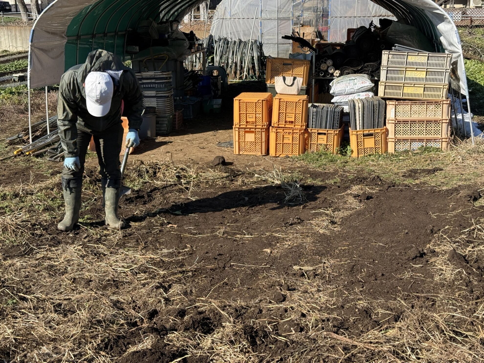 斉藤さんの上の畑で、コンテナ置き場を堆肥置き場にする為に、コンテナの移動、コンテナの下に敷いていたマルチ剥がし作業。
