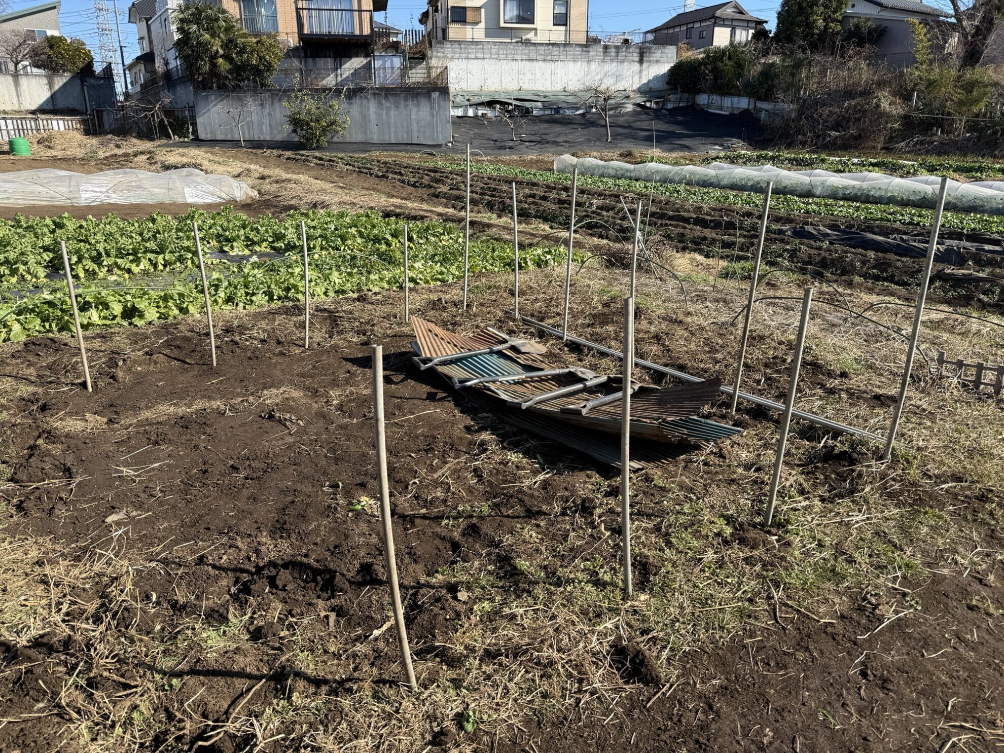 マルチを剥がした後に堆肥置き場に囲いを作る為に支柱立て作業。