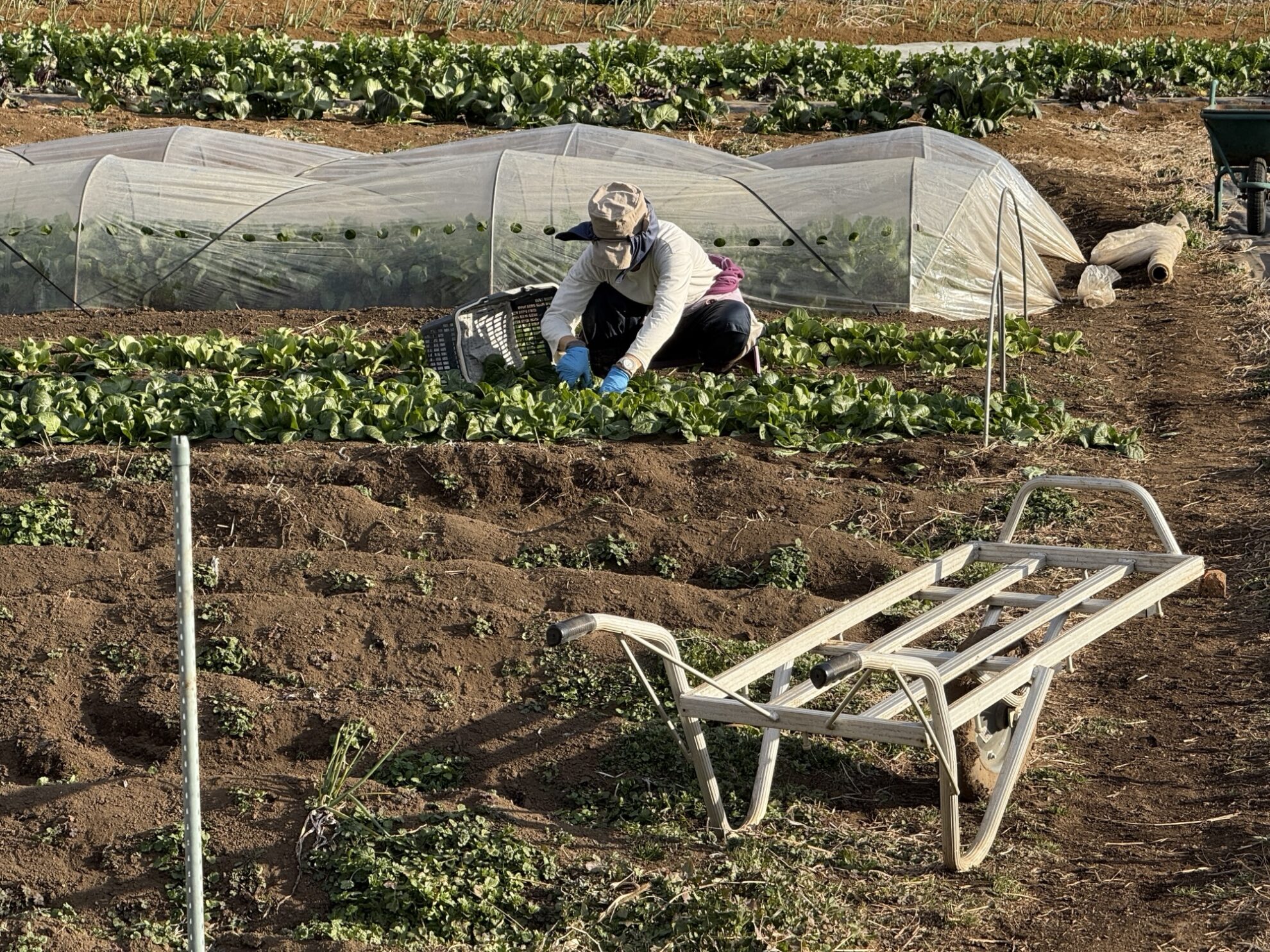 田中さんの下の畑で、小松菜の収穫作業。