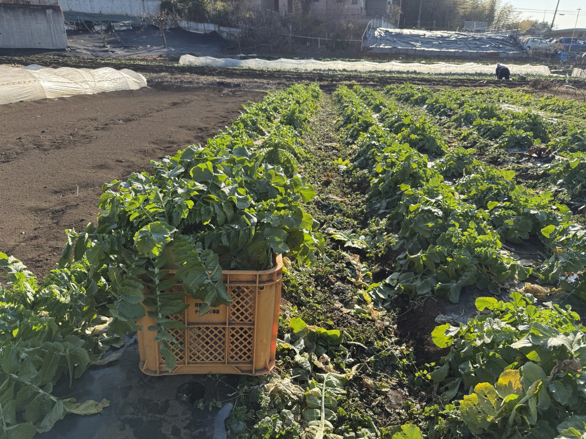 強力大根(青首大根)、黄かぶ(味こがね)の収穫作業。