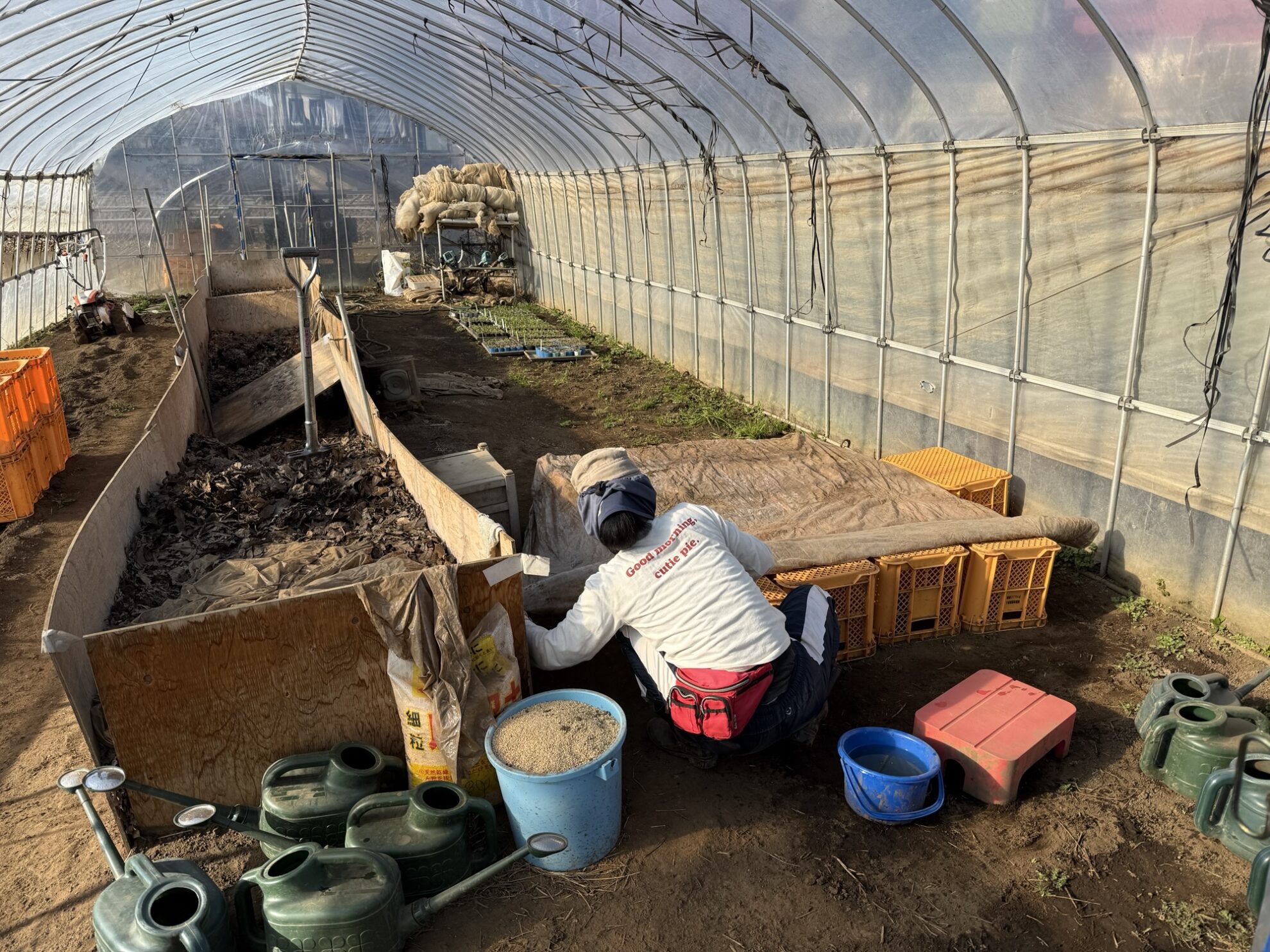 斉藤さん畑のビニールハウス内で、絹さや、スナックエンドウ、そら豆、グリーンピース、玉ねぎの苗とハーブ類に水やり作業。