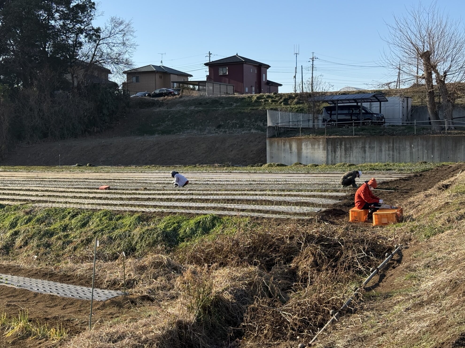 斉藤さんの下の畑で、ほうれん草の収穫作業。
