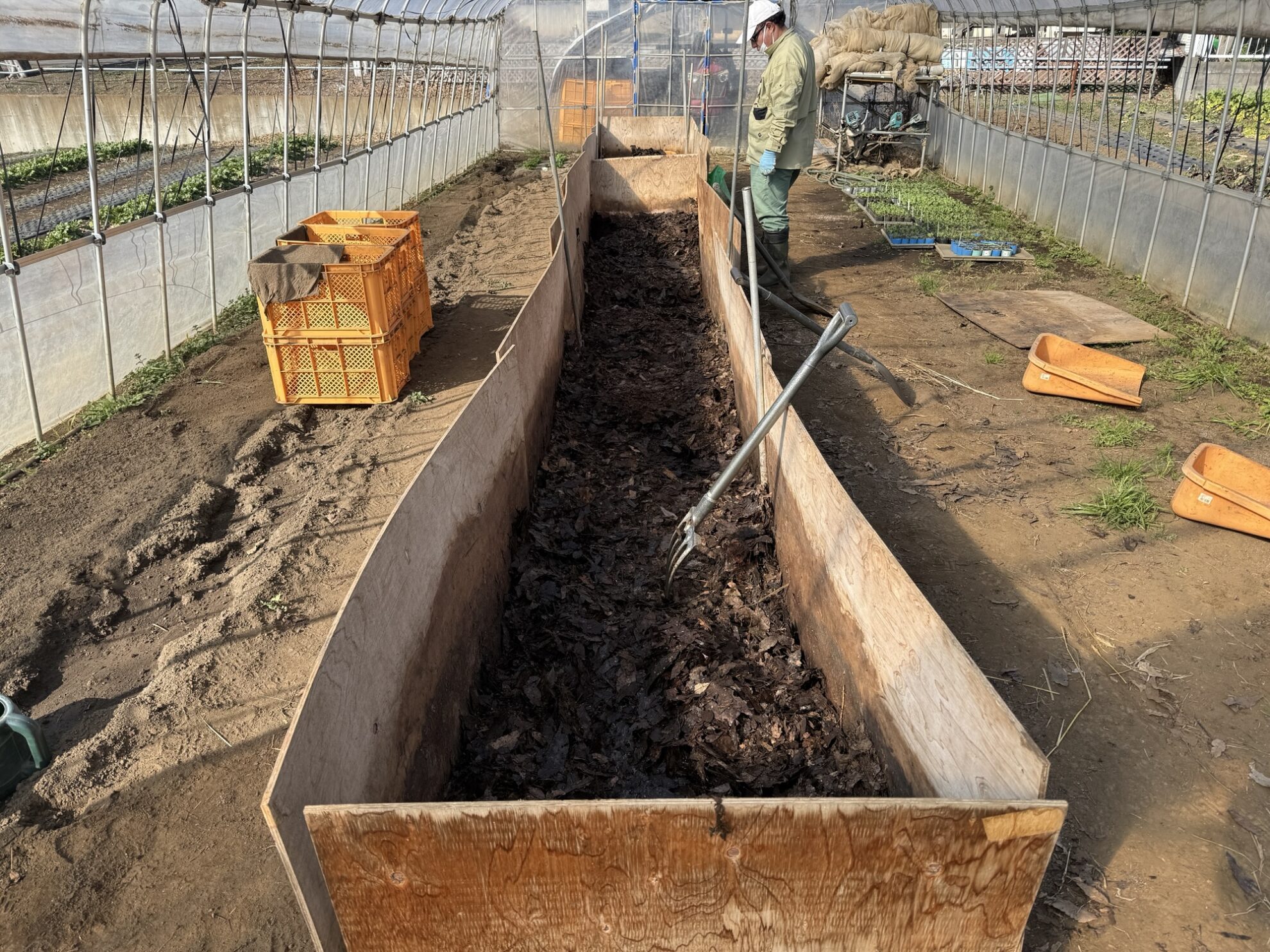 斉藤さん畑のビニールハウス内の踏み込み温床の堆肥を斉藤さんの上の畑の堆肥置き場に移動する作業。
