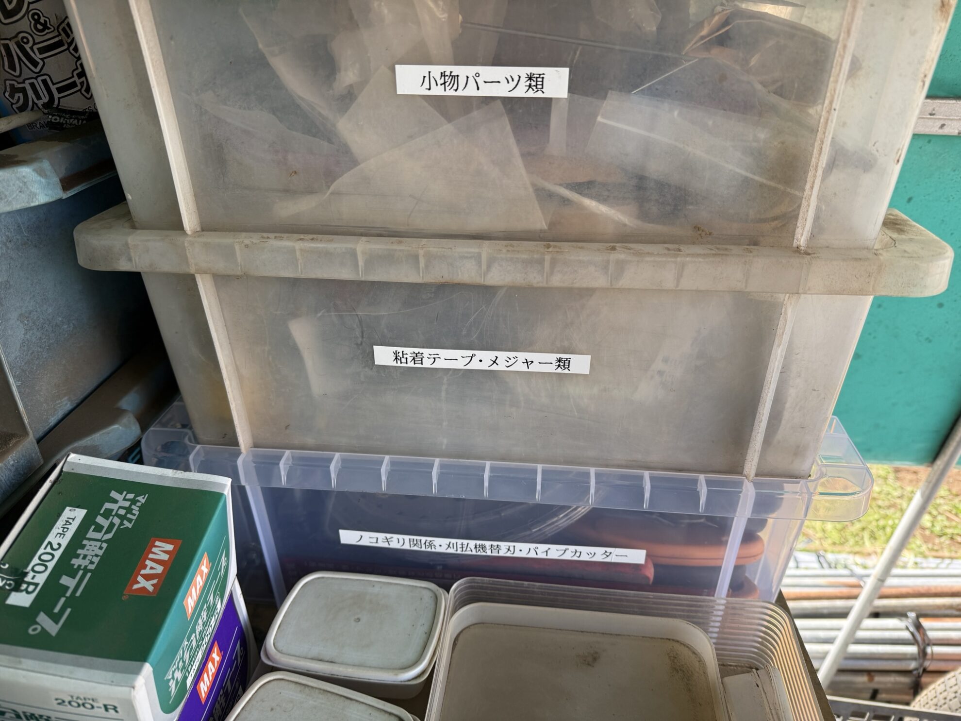 斉藤さんの上の畑の休憩所で、収納ケース類に名前のシール貼り作業。