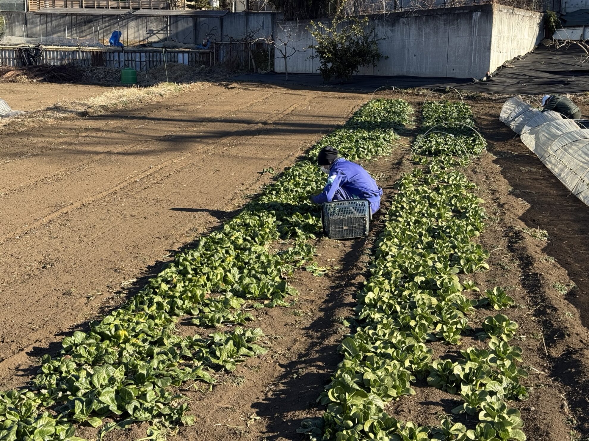 斉藤さんの最下段畑で、わさび菜の収穫作業。