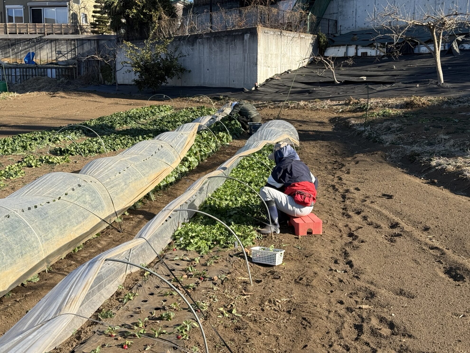 田中さんの下の畑で、小松菜、ラディッシュ、ルッコラ、間引き赤かぶの収穫作業。