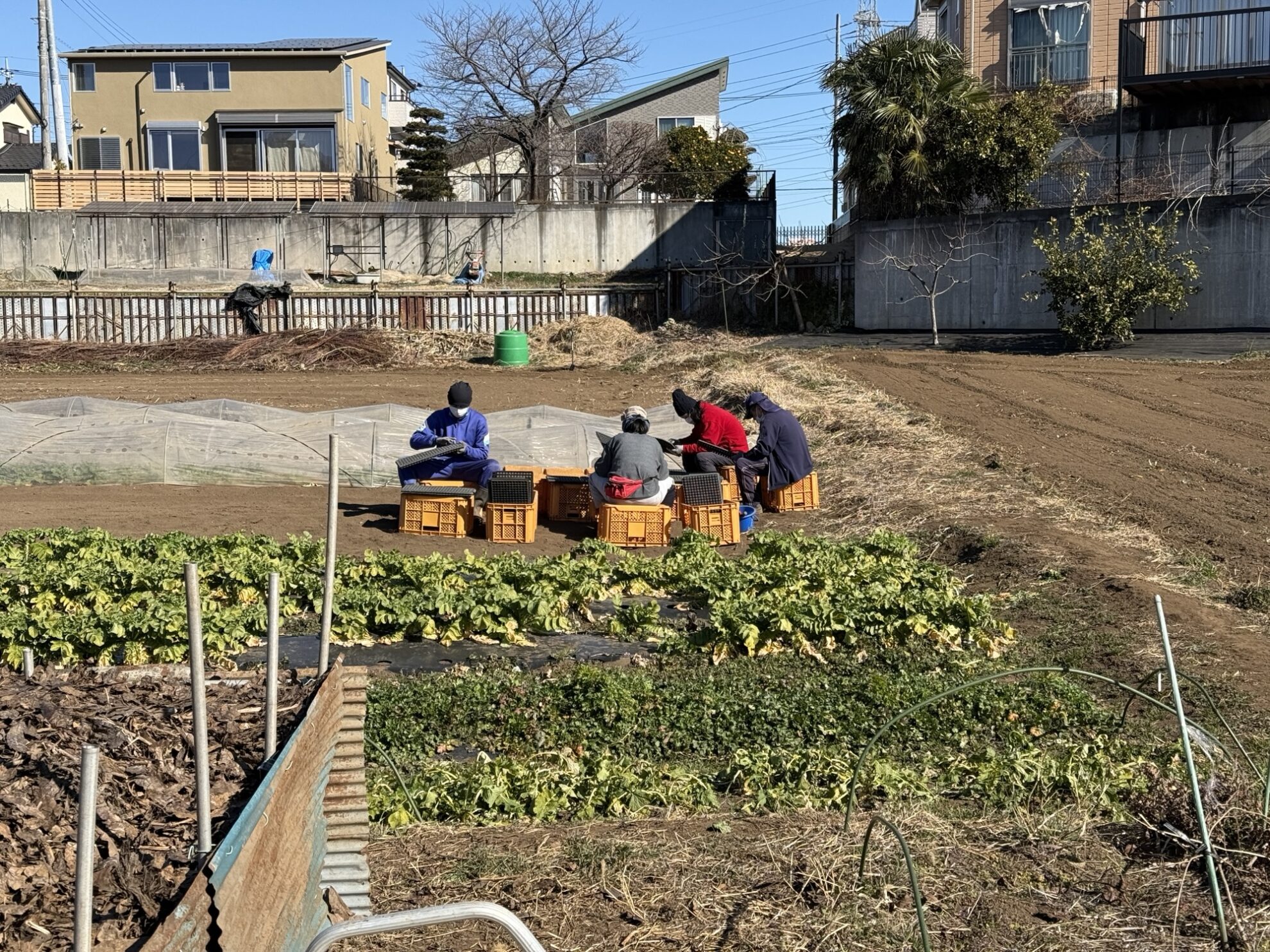 斉藤さんの上の畑で、セルトレイの土落とし作業。