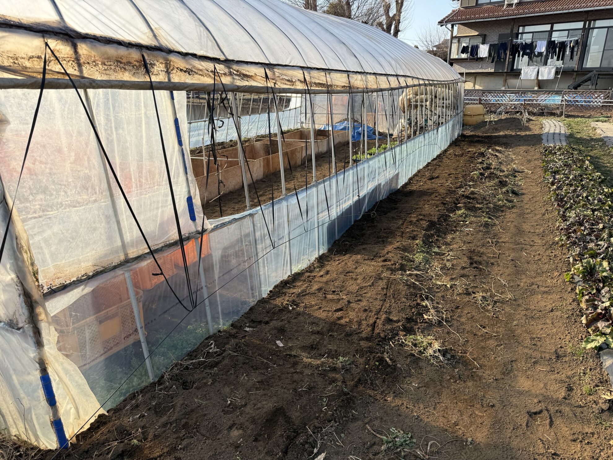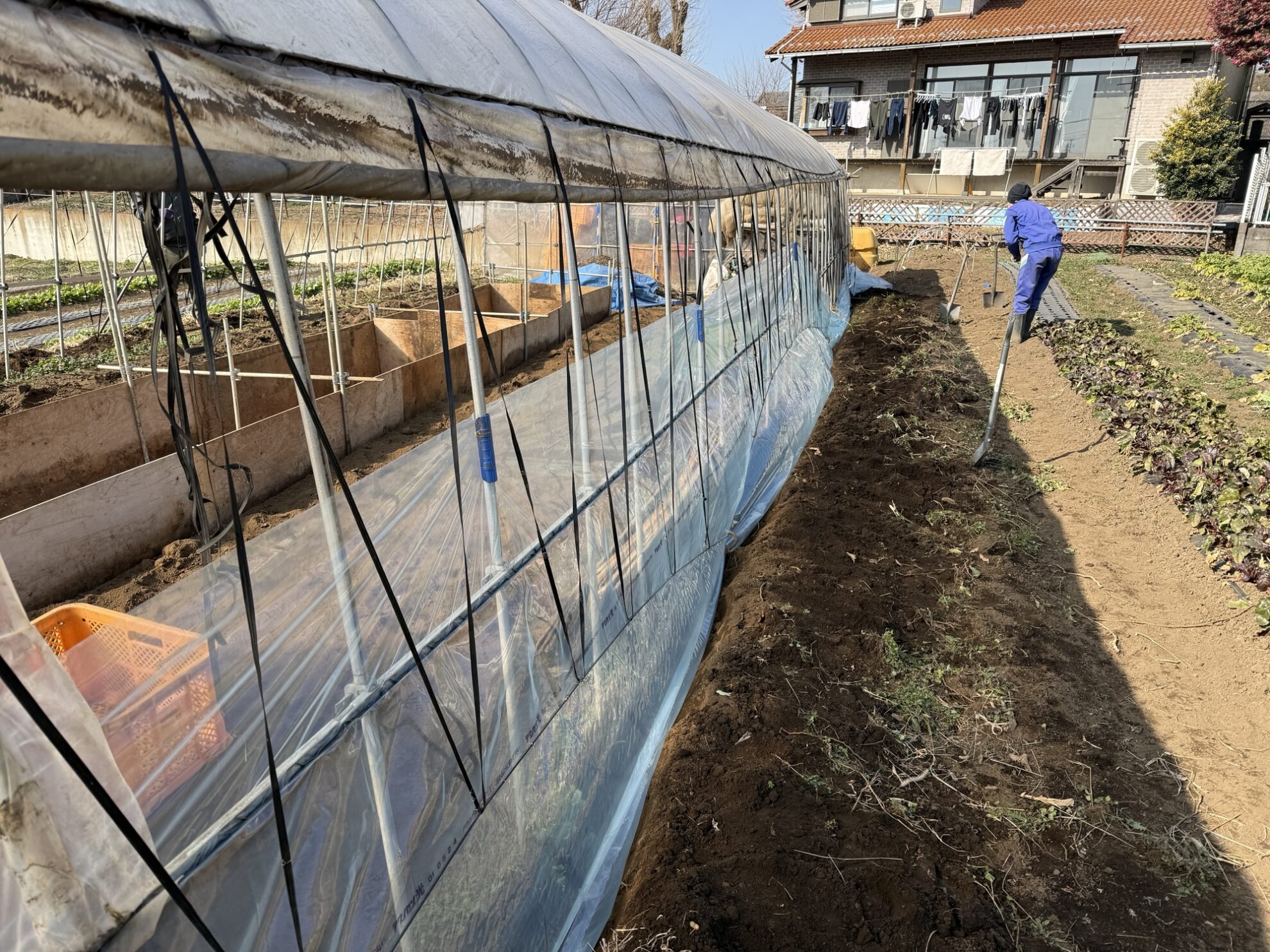 斉藤さん畑のビニールハウスの腰巻ビニール交換作業。