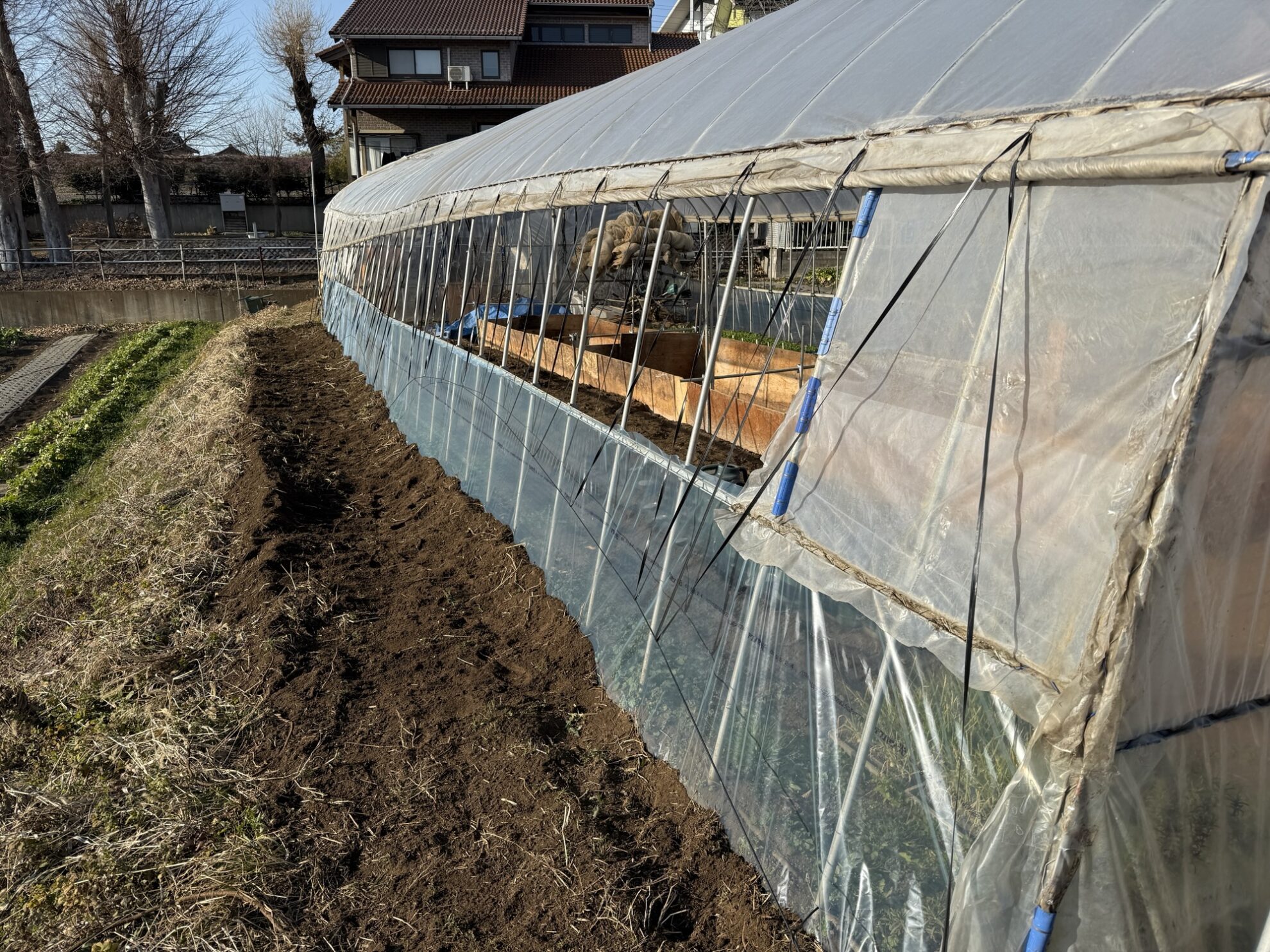 斉藤さん畑のビニールハウスの腰巻ビニール交換作業。