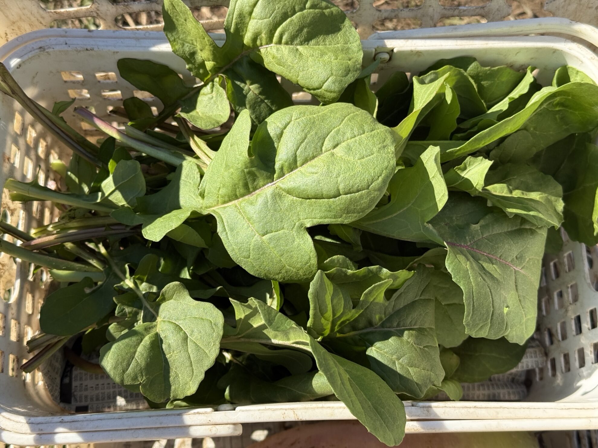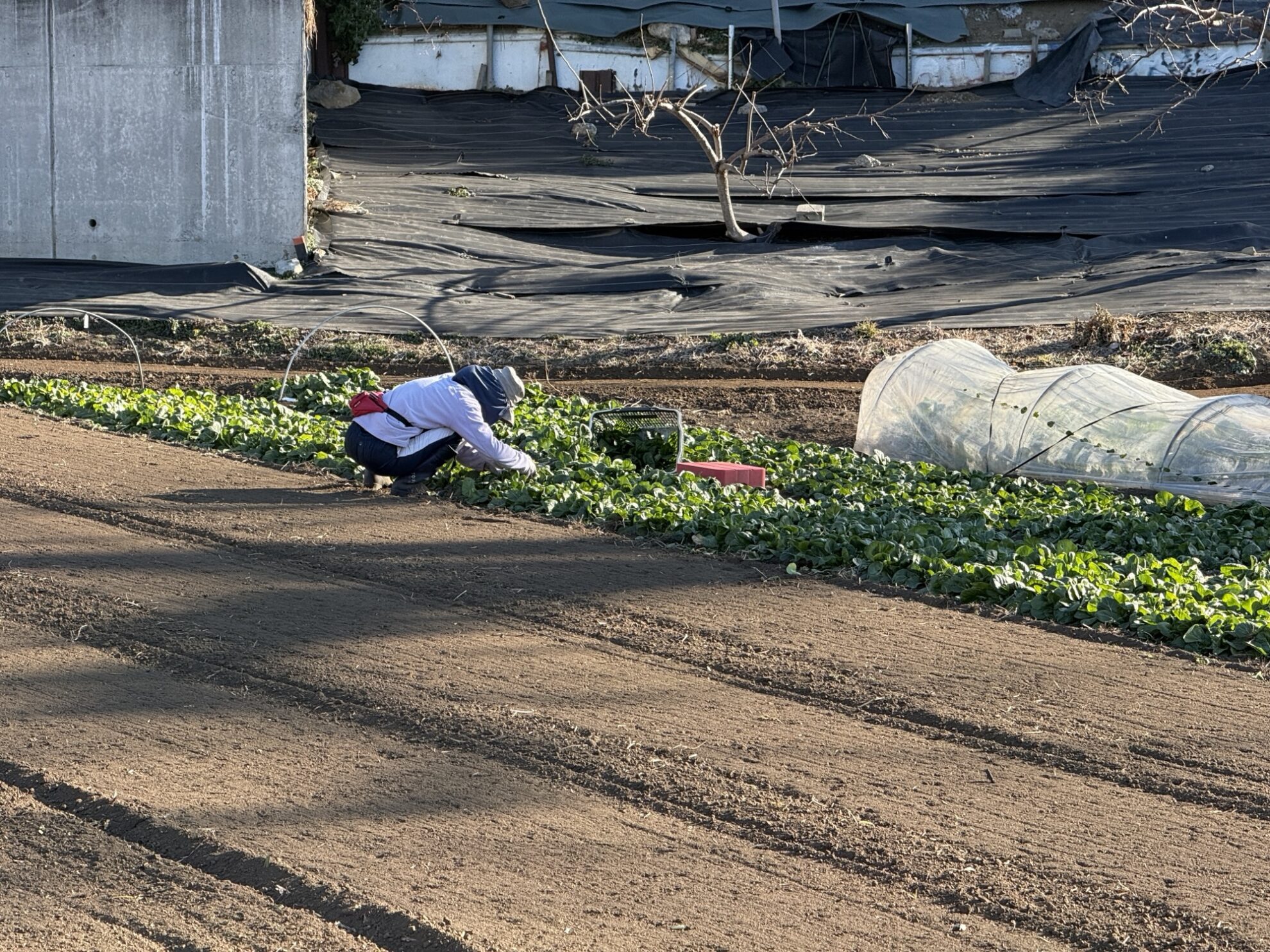 斉藤さんの最下段畑で、わさび菜、アスパラ菜、寒咲花菜の収穫作業。