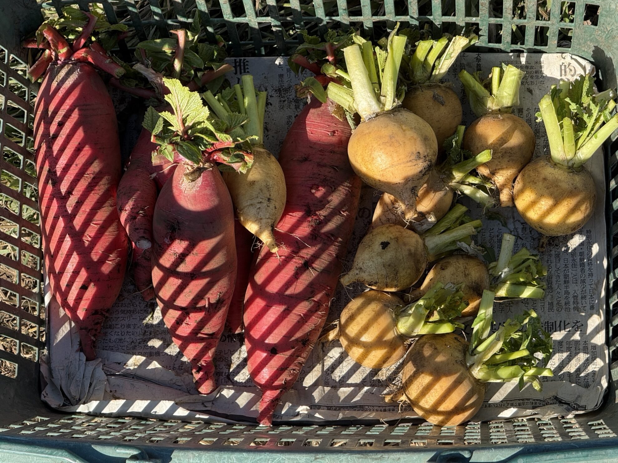 斉藤さんの上の畑で、強力大根(青首大根)、赤大根、黄かぶ(味こがね)の収穫作業。