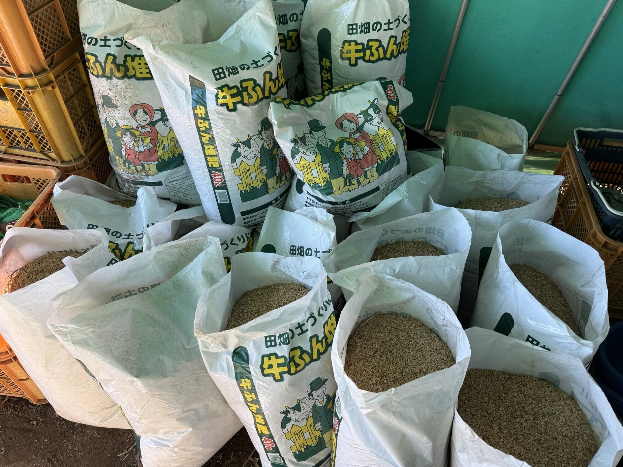 斉藤さんの下の畑で、ネットに入っている籾殻を袋に入れ替える作業。