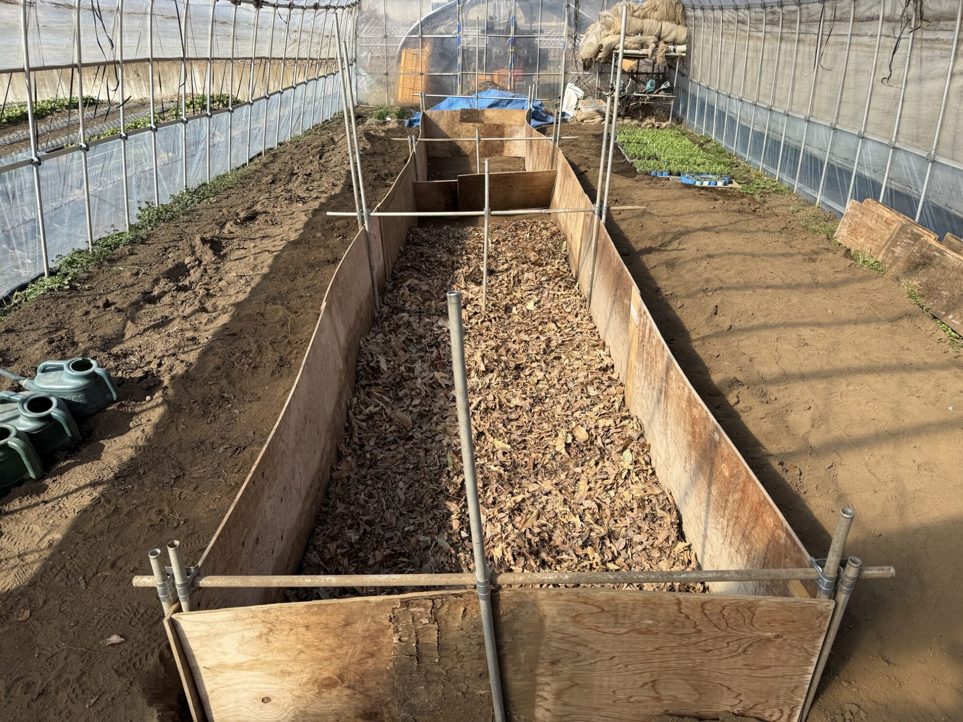 斉藤さん畑のビニールハウス内の踏み込み温床に落ち葉を入れる作業。
