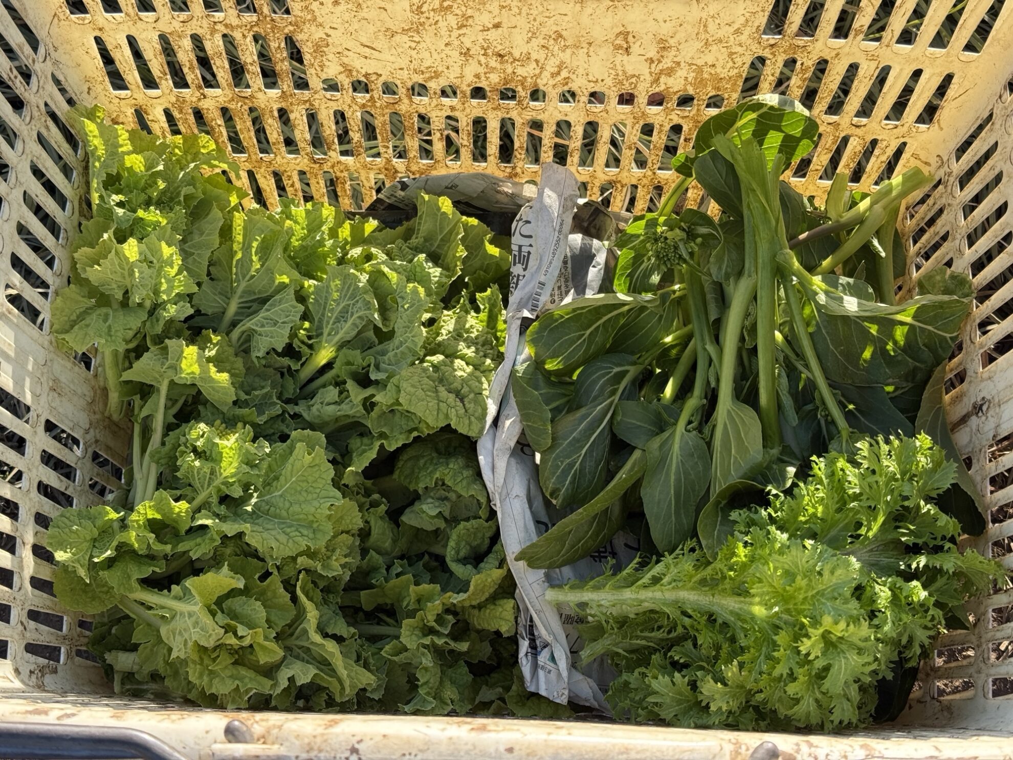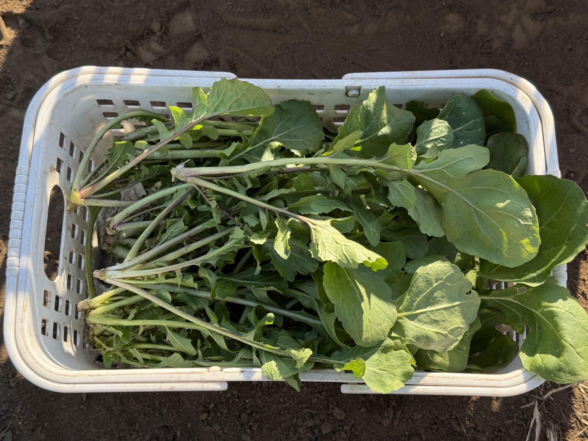 斉藤さんの最下段畑で、わさび菜、アスパラ菜、寒咲花菜の収穫作業。