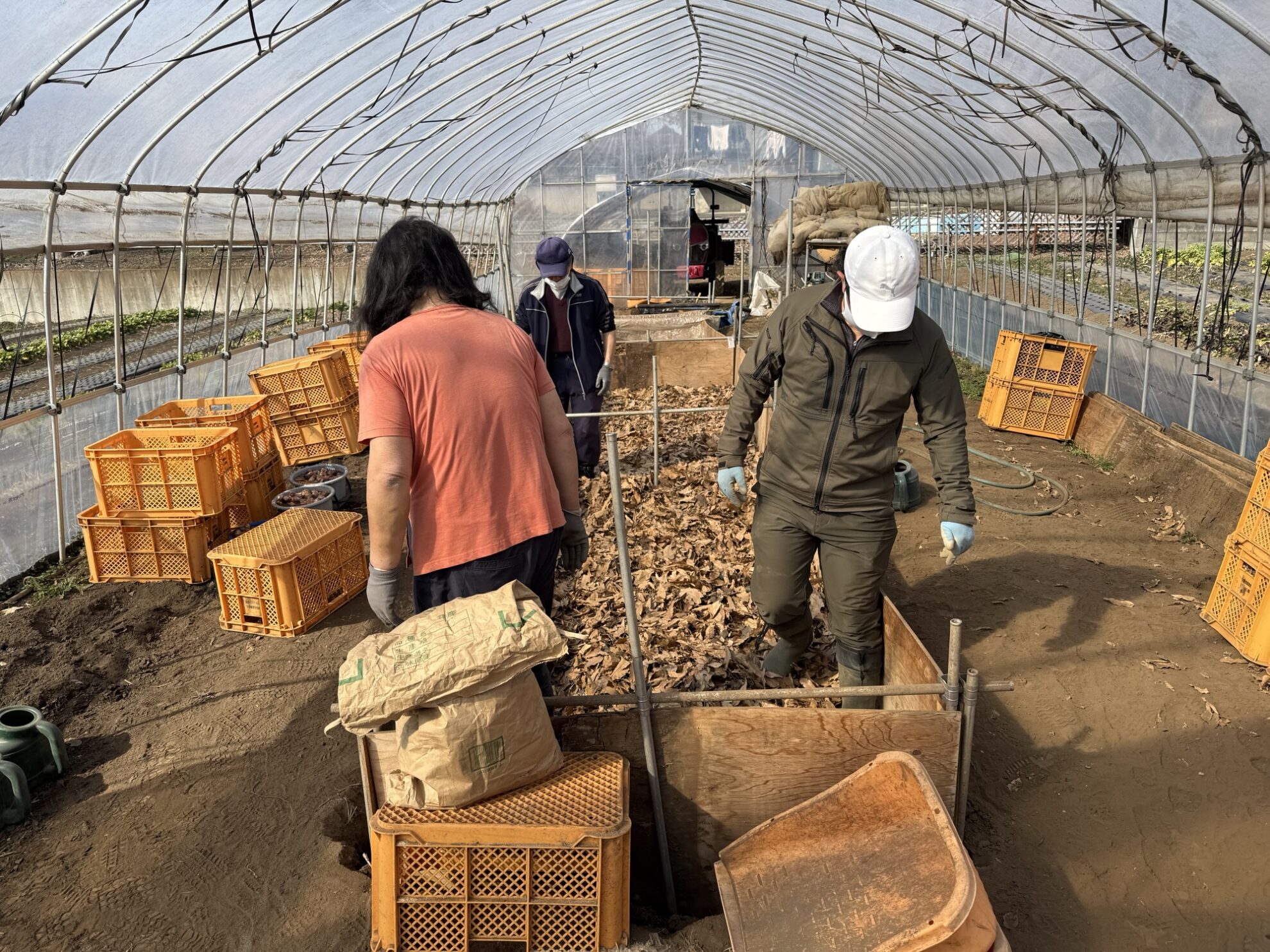 斉藤はん畑のビニールハウス内で、踏み込み温床作り作業。