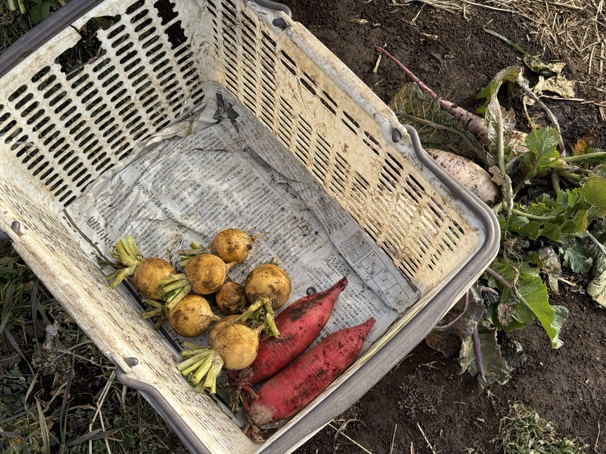 田中さんの下の畑で、赤かぶ、小松菜の収穫作業。