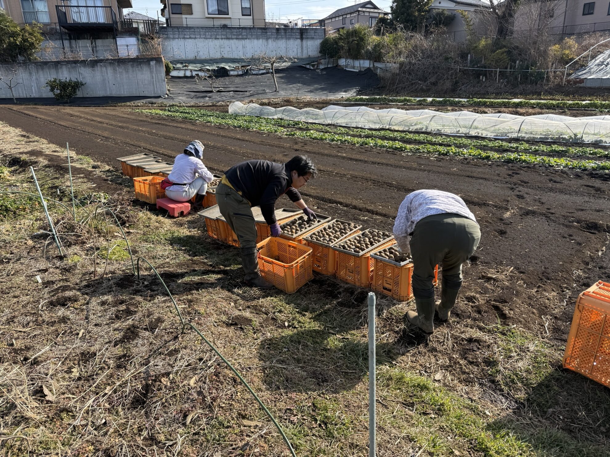 斉藤さんの上の畑で、午前中に天日干しにしたジャガイモの種芋の片付け作業。