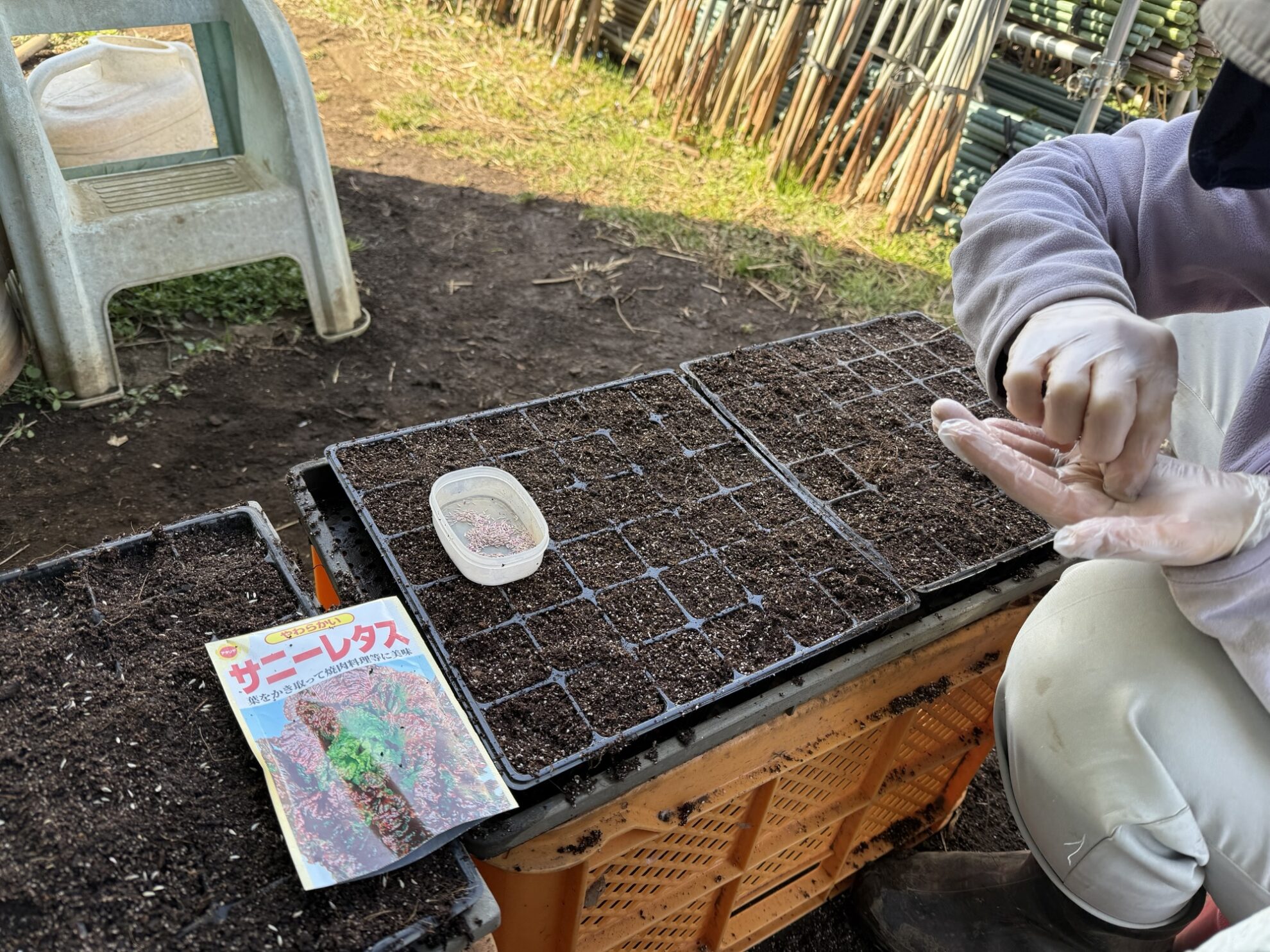 斉藤さんの上の畑の休憩所で、玉レタス、サニーレタス、リーフレタスの播種作業。
