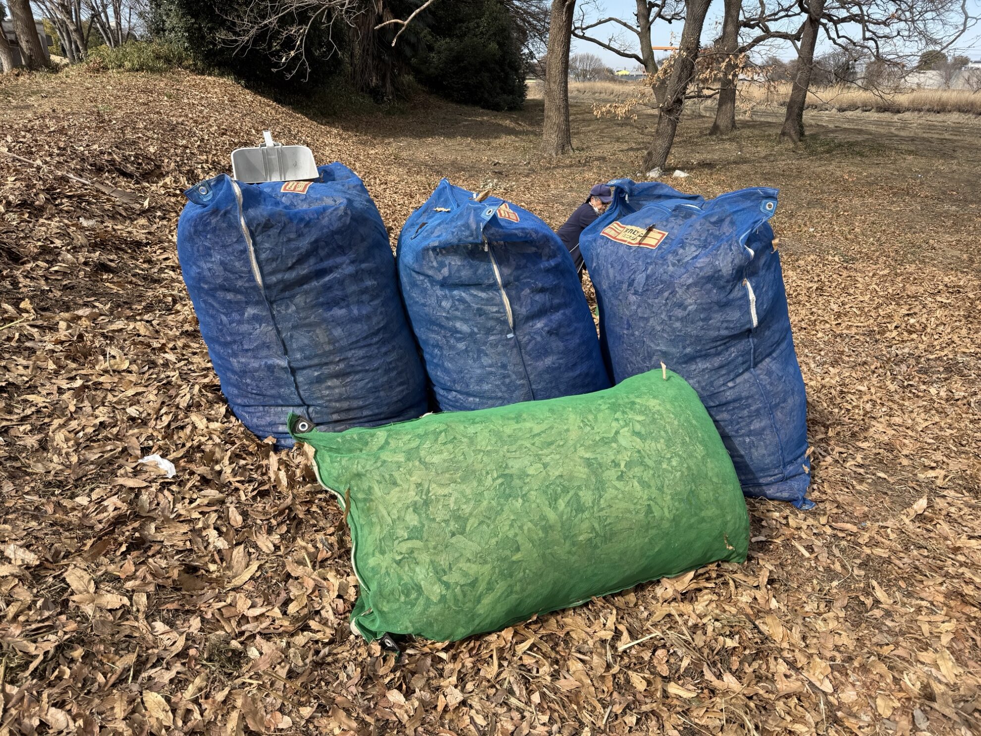 岩槻文化公園で踏み込み温床用の落ち葉回収作業。