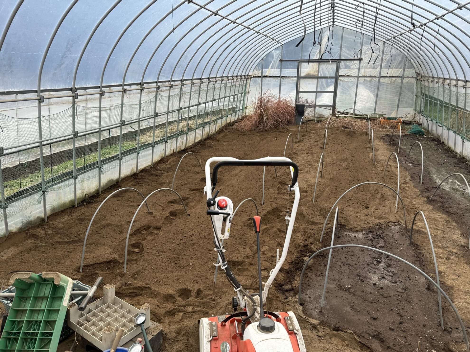 鈴木さん畑のビニールハウス内で、小型耕運機を使い耕耘作業。