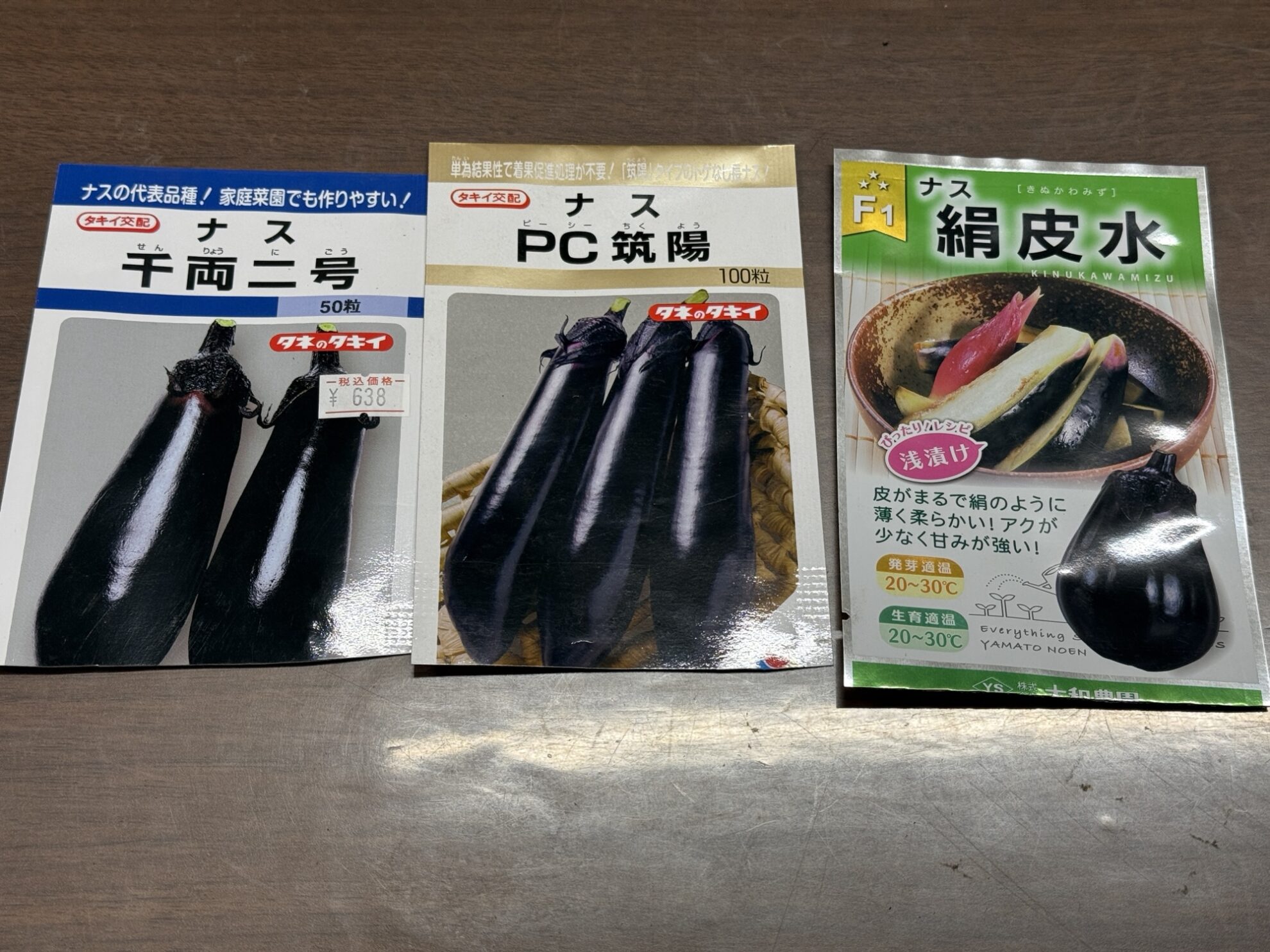 斉藤さん畑のビニールハウス内で、長茄子(PC筑陽)400株分、万能茄子(千両2号)50株分、ピーマン(カルフォルニアワンダー)約100株、水茄子(絹皮水)約50株の播種作業。