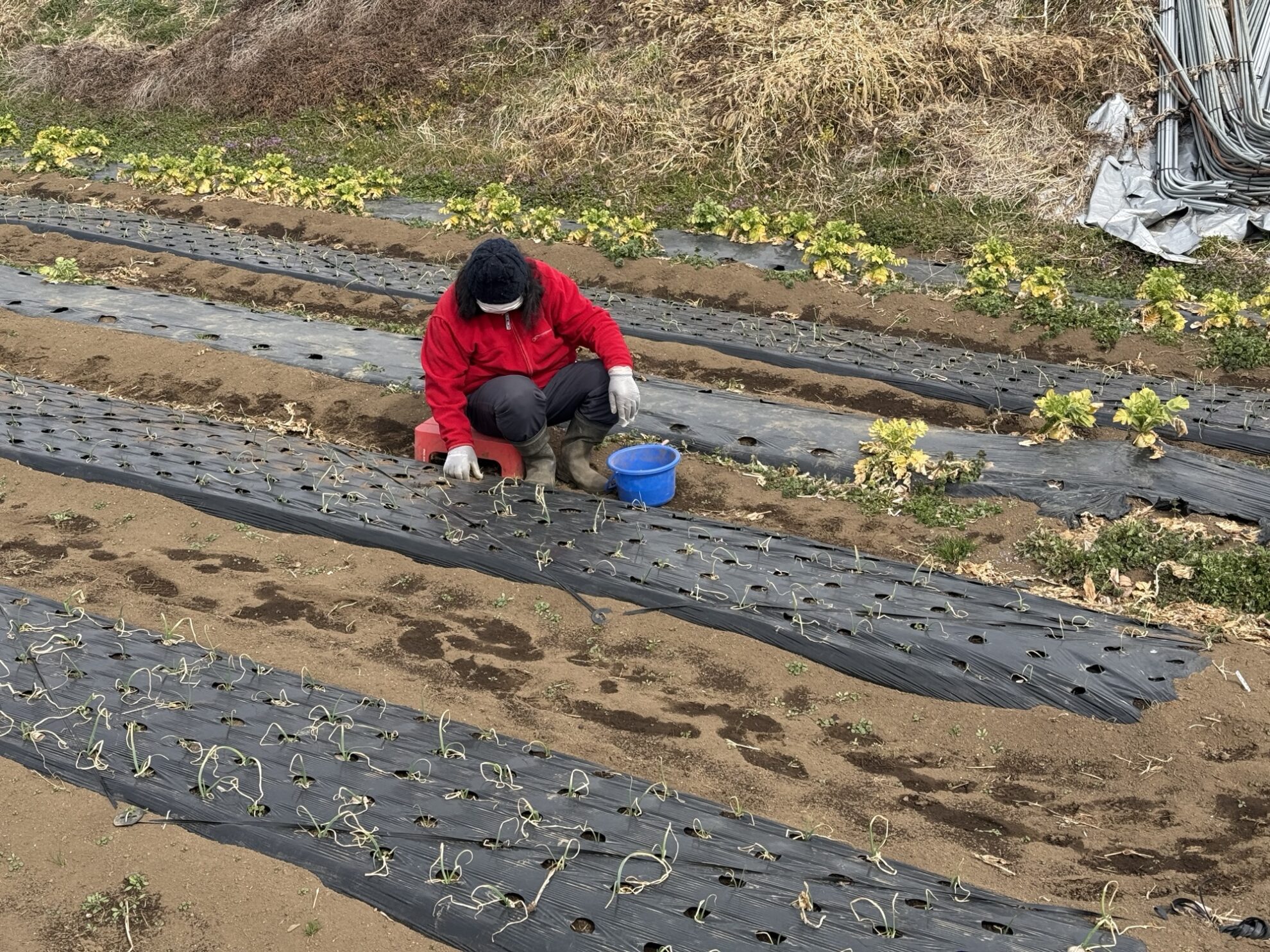 斉藤さんの中の畑で、早生赤玉ねぎ、早生玉ねぎの追肥作業。