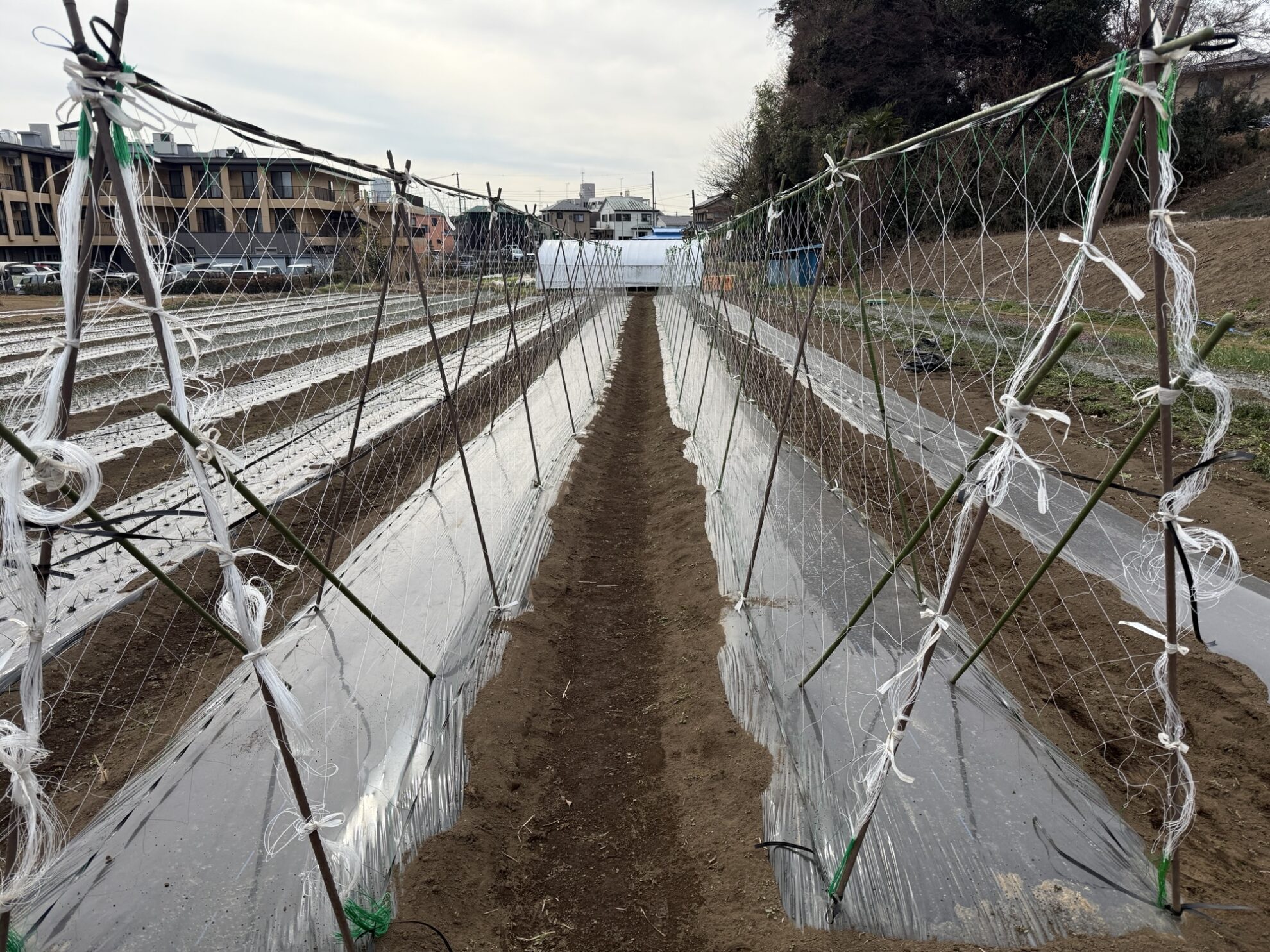 斉藤さんの下の畑で、絹さや、グリーンピース、スナックエンドウ用のネット張り作業。