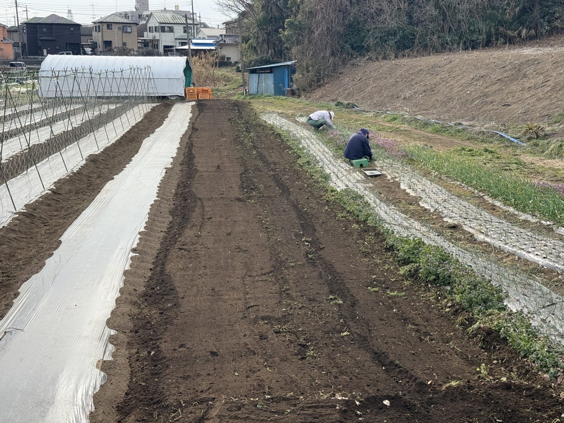 斉藤さんの下の畑で、ほうれん草のマルチ剥がし作業。