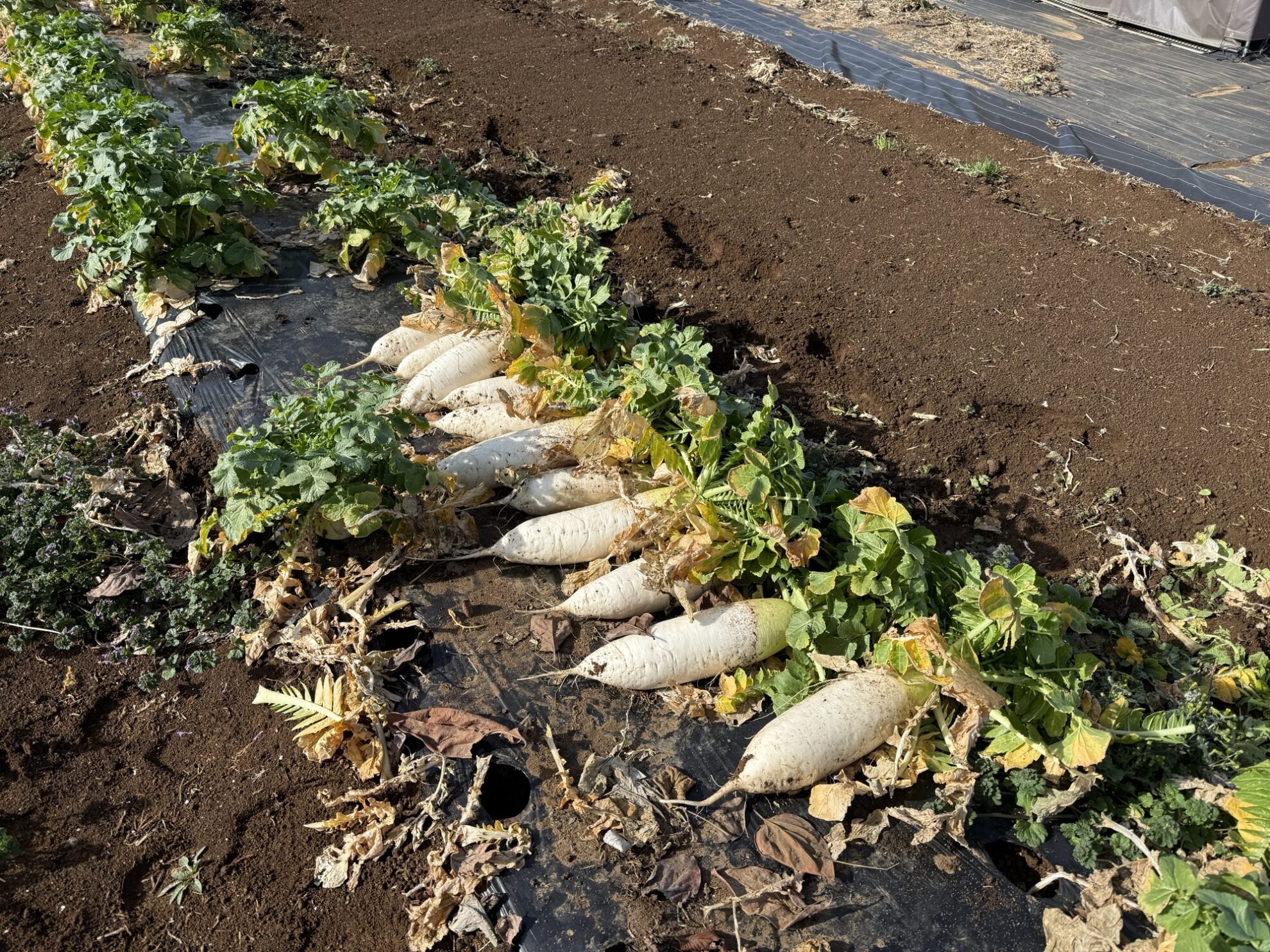 田中さんの上の畑で、強力大根(青首大根)の収穫作業。