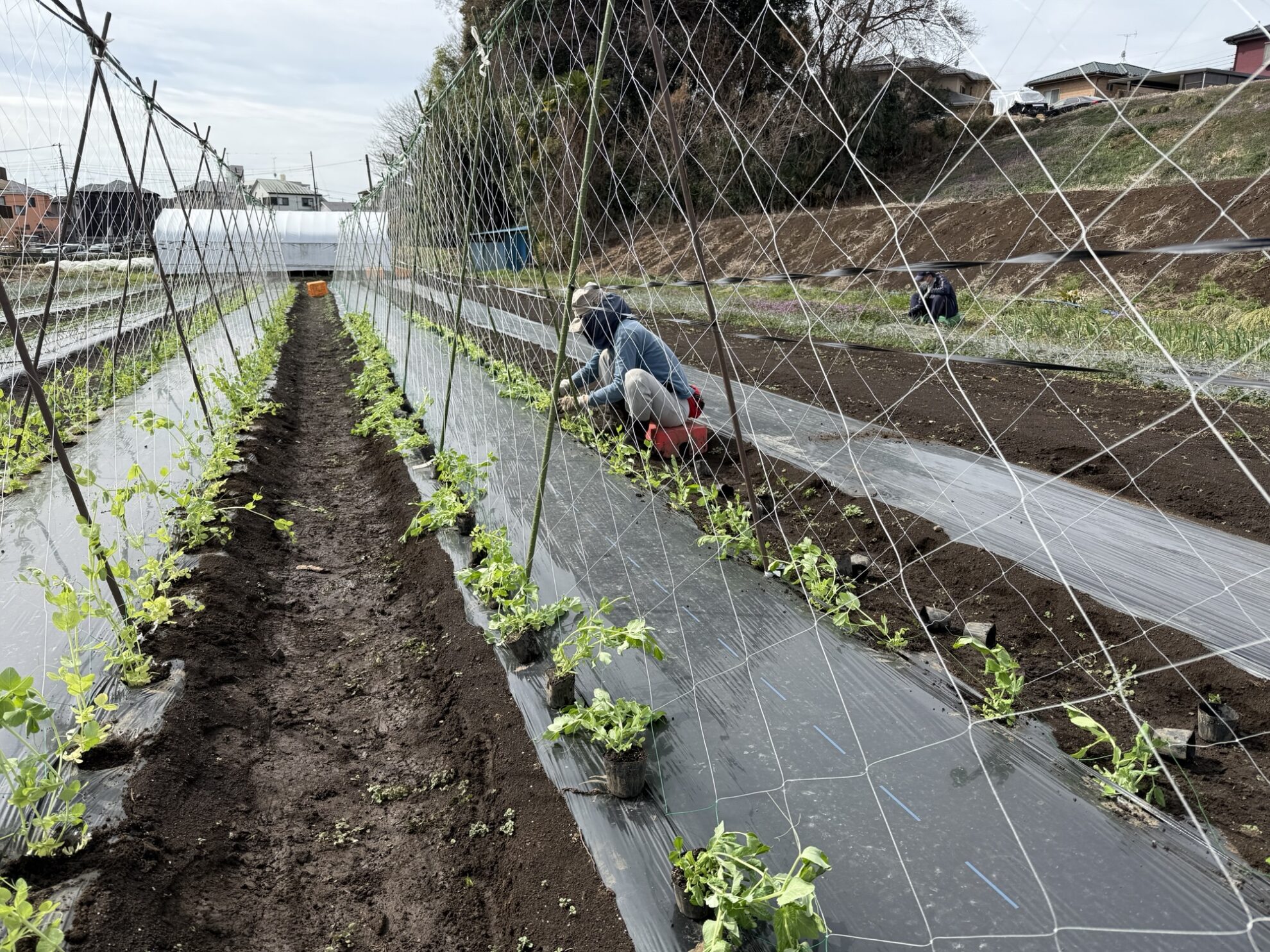 斉藤さんの下の畑で、スナックエンドウの定植作業。
