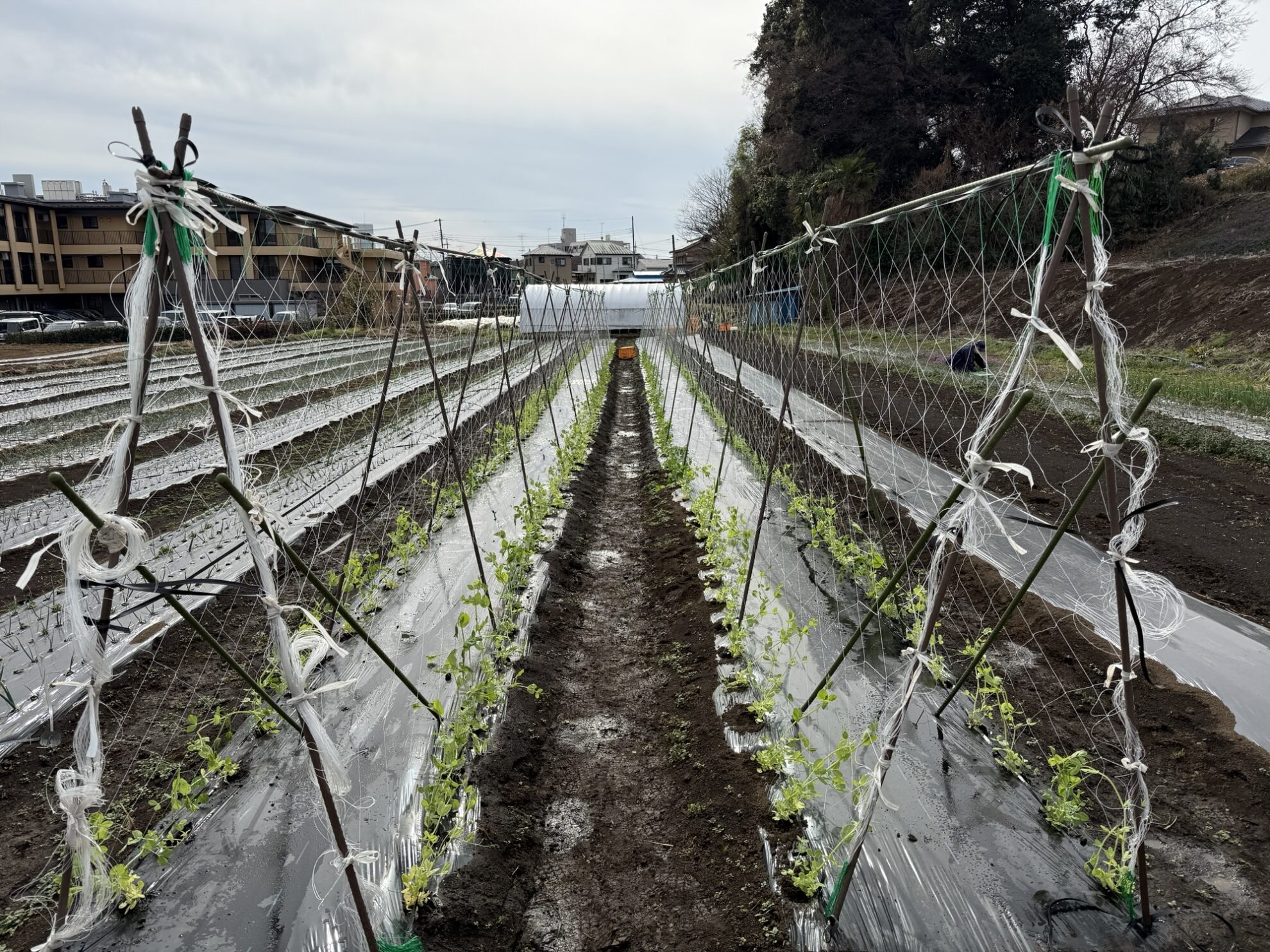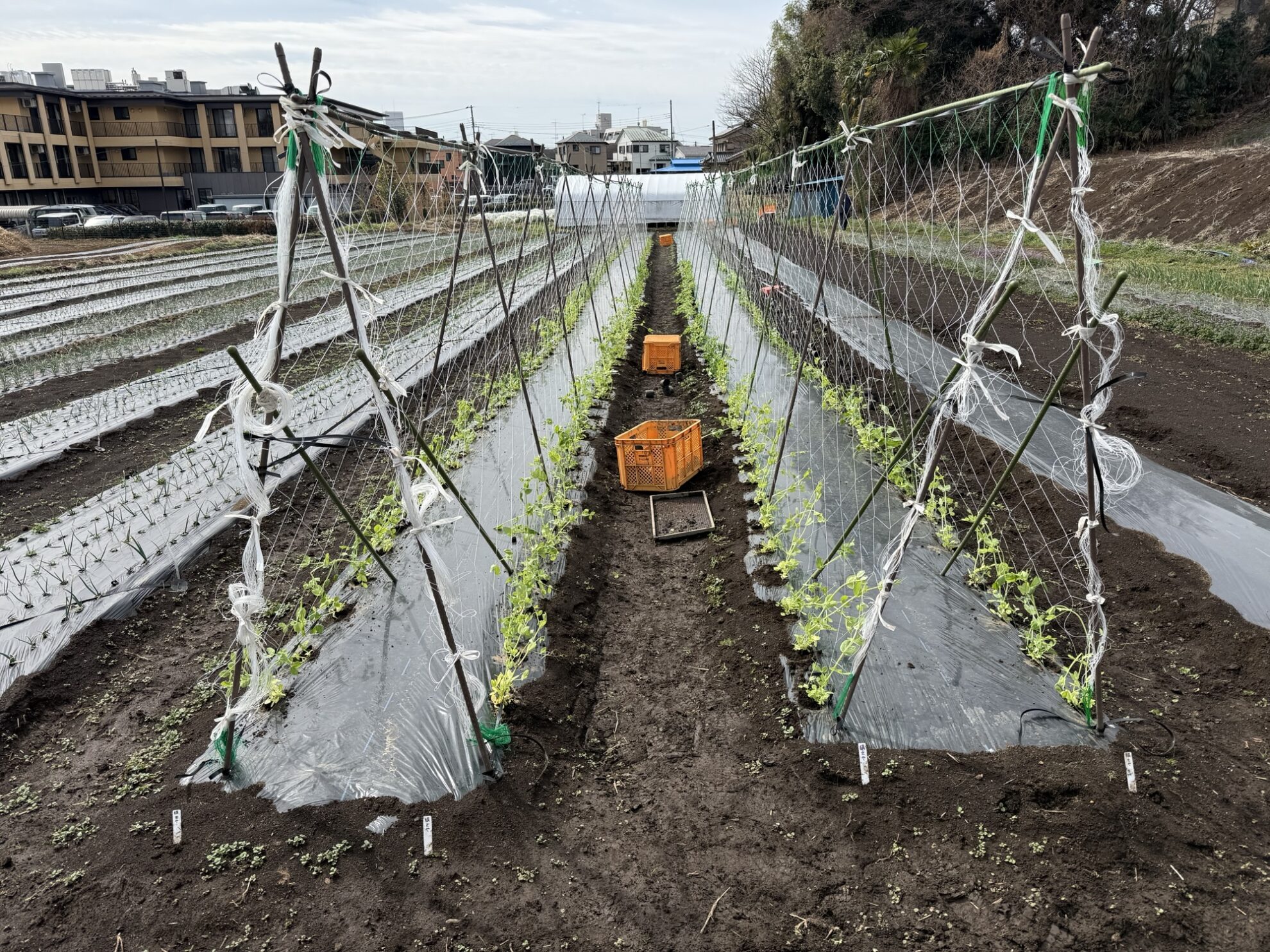 斉藤さんの下の畑で、絹さや(白花)、スナックエンドウの定植作業。