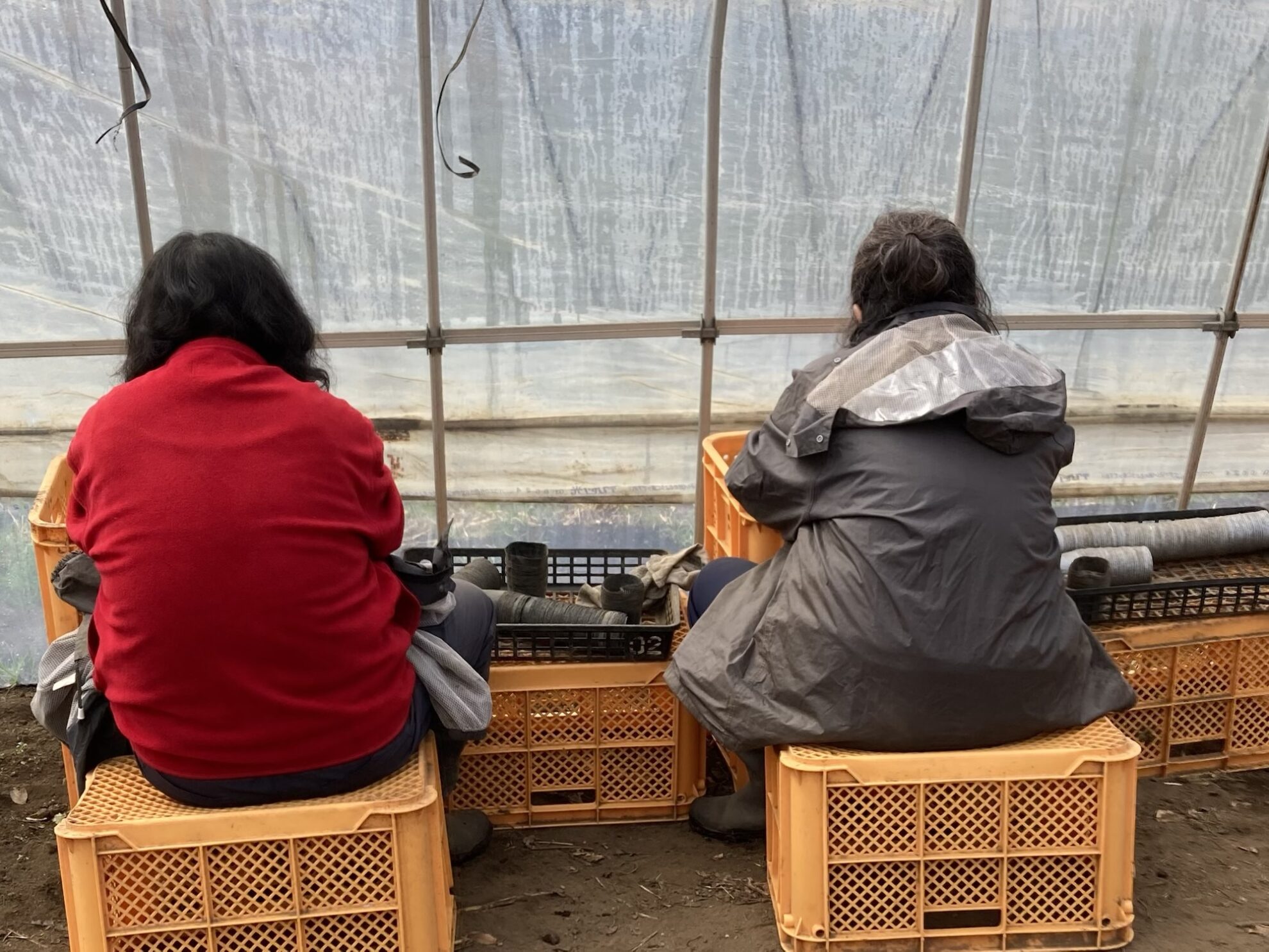 斉藤さん畑のビニールハウス内で、育苗ポットの土落とし作業。