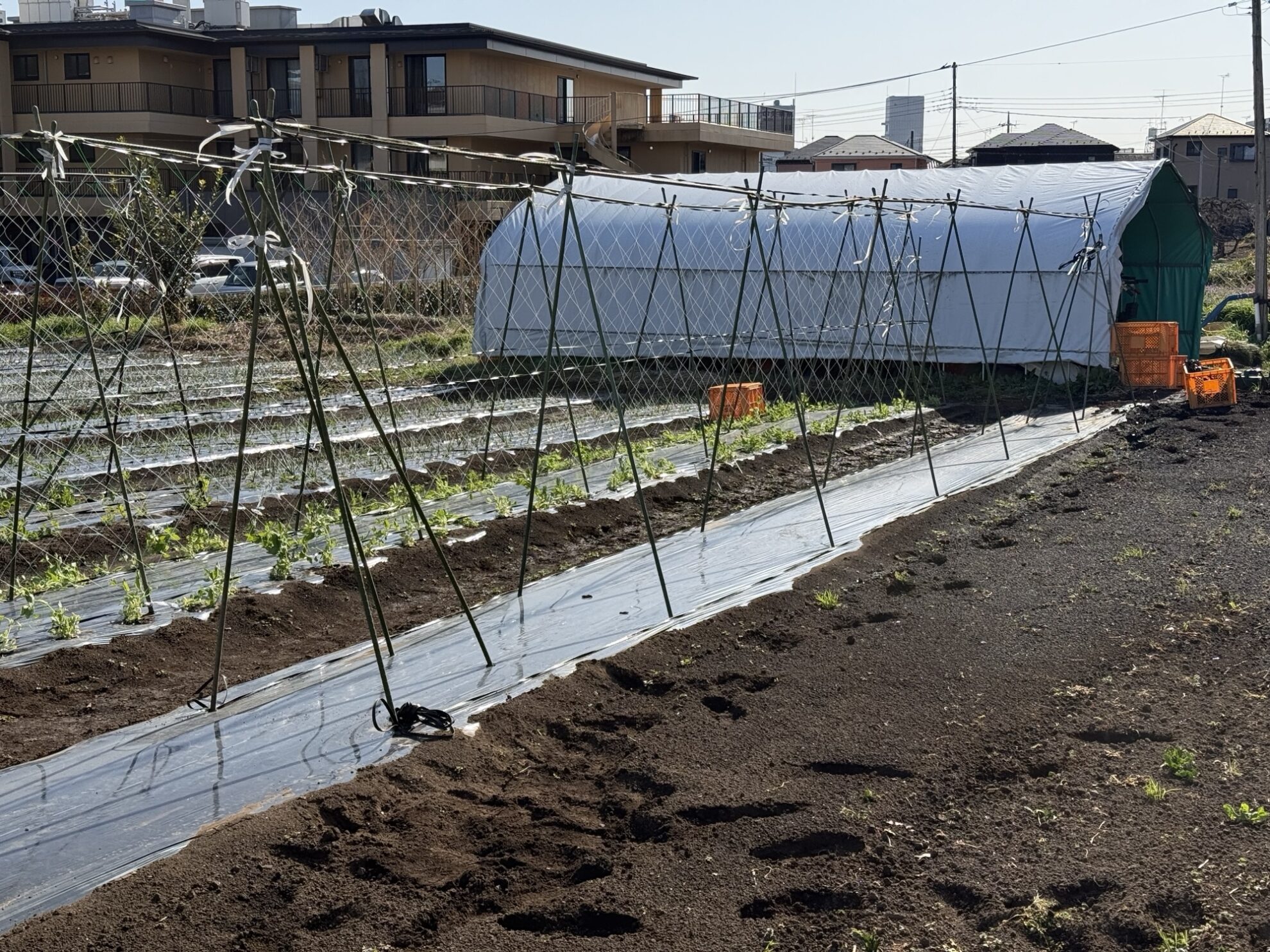 鈴木さん畑で、ブロッコリー、スティックブロッコリーの防虫ネット(防鳥目的)のパッカー留め作業。