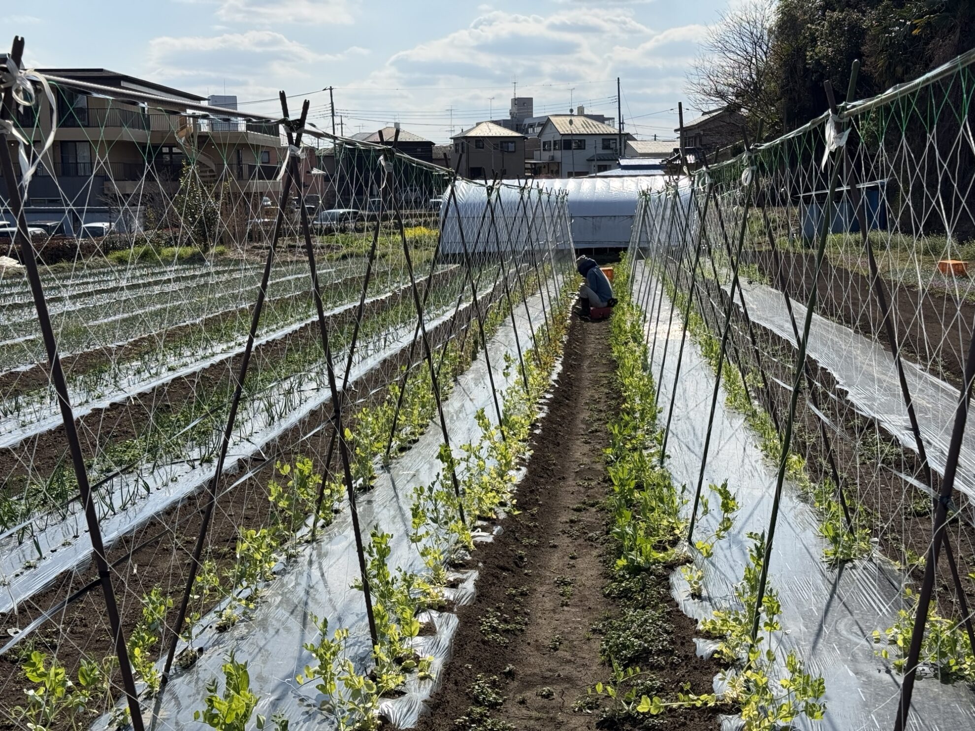 2026年3月16日(月)の作業記録 (玉ねぎ・らっきょうの追肥作業、春どり大根・二十日大根・ルッコラの防虫ネット張り作業、絹さや・スナックエンドウの誘引作業)