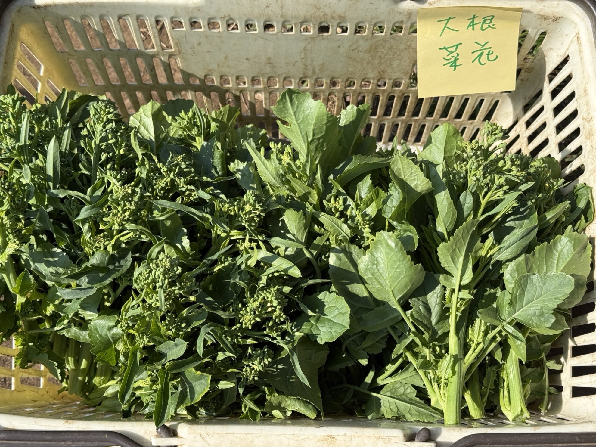 斉藤さんの中の畑で、おでん大根と青首大根の菜花の収穫作業。