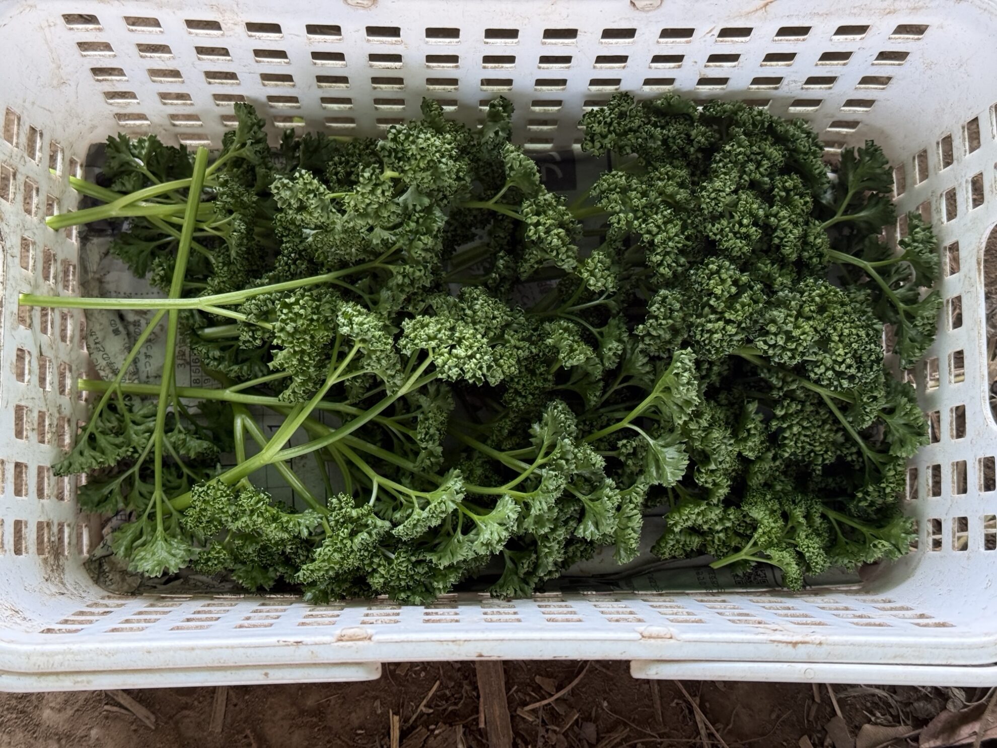 斉藤さん畑のビニールハウス内で、パセリの収穫作業。