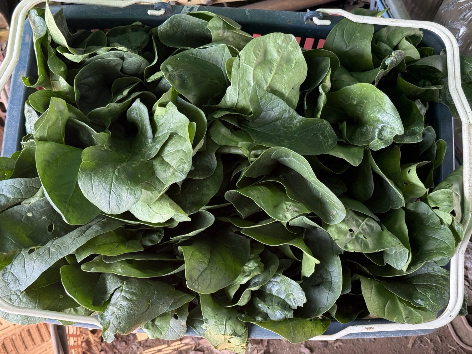 斉藤さんの上の畑で、強力大根(青首大根)の菜花、ほうれん草、間引き人参の収穫作業。